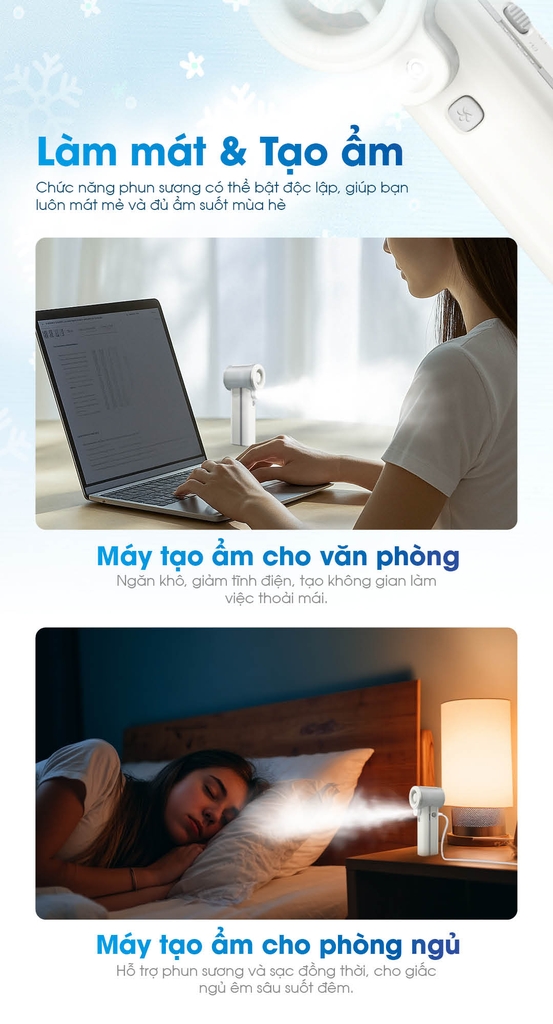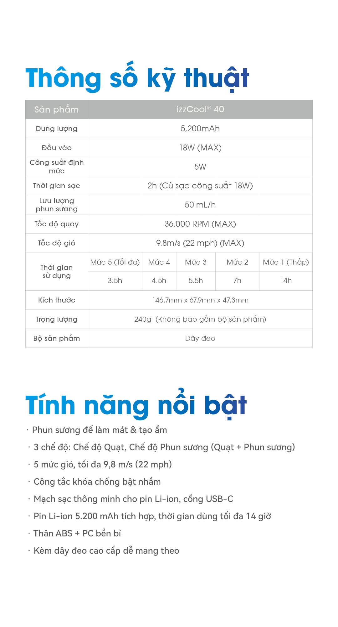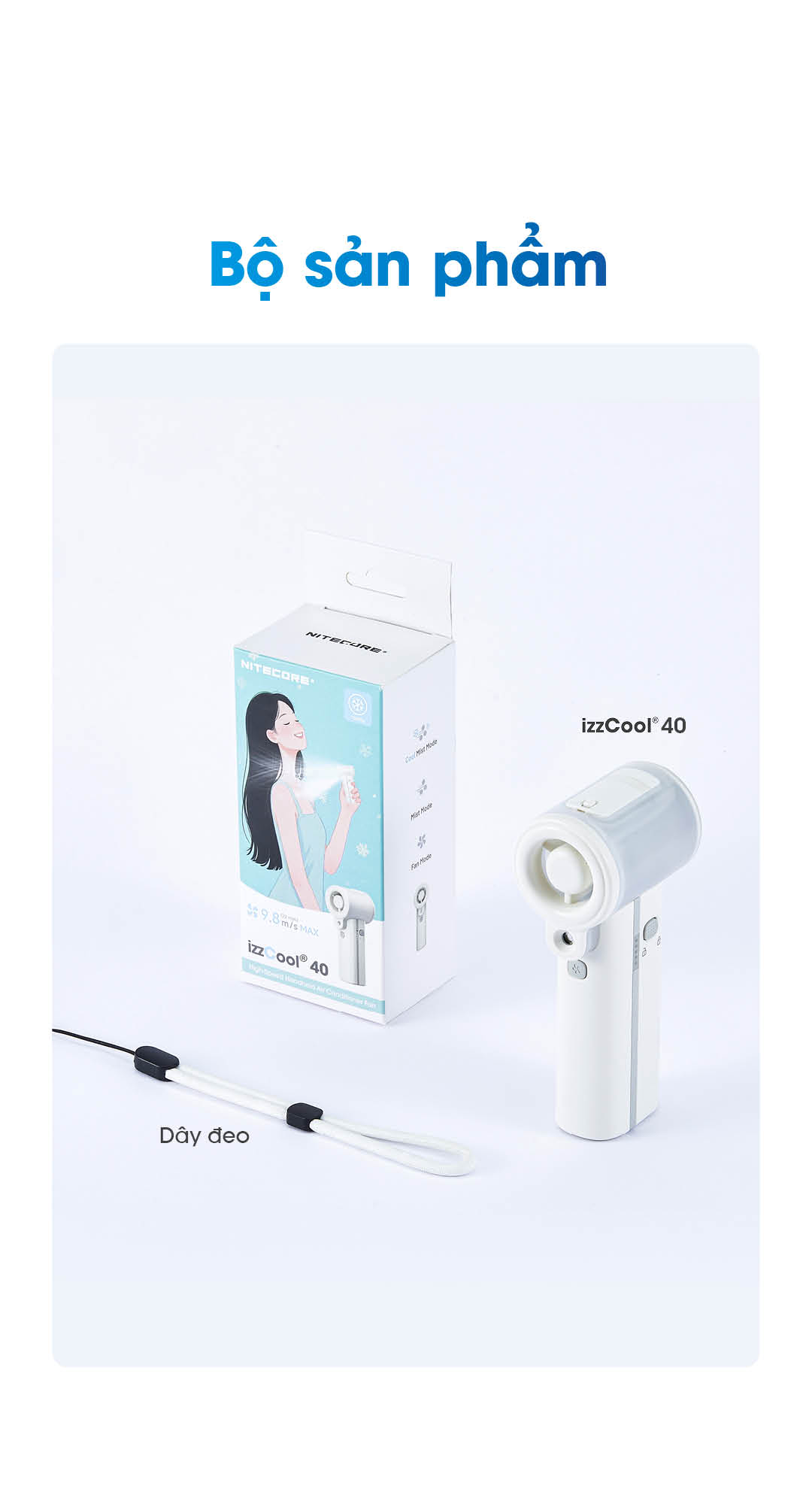 NITECORE izzCool™ 40 là quạt hơi nước mini cầm tay tốc độ cao, cổng suất 5W, tốc độ gió 9.8m/s với động cơ 36.000 RPM và phun sương siêu âm 50ml/h. Thiết kế bình nước dạng vòng ôm quanh đầu quạt gọn gàng, trọng lượng chỉ 240g, tích hợp pin 5.200mAh cho thời gian dùng tối đa 14h, sạc nhanh USB-C 18W. Hạ cảm nhận nhiệt tới -16°C (theo điều kiện kiểm tra của hãng), giúp bạn mát mẻ mọi lúc.