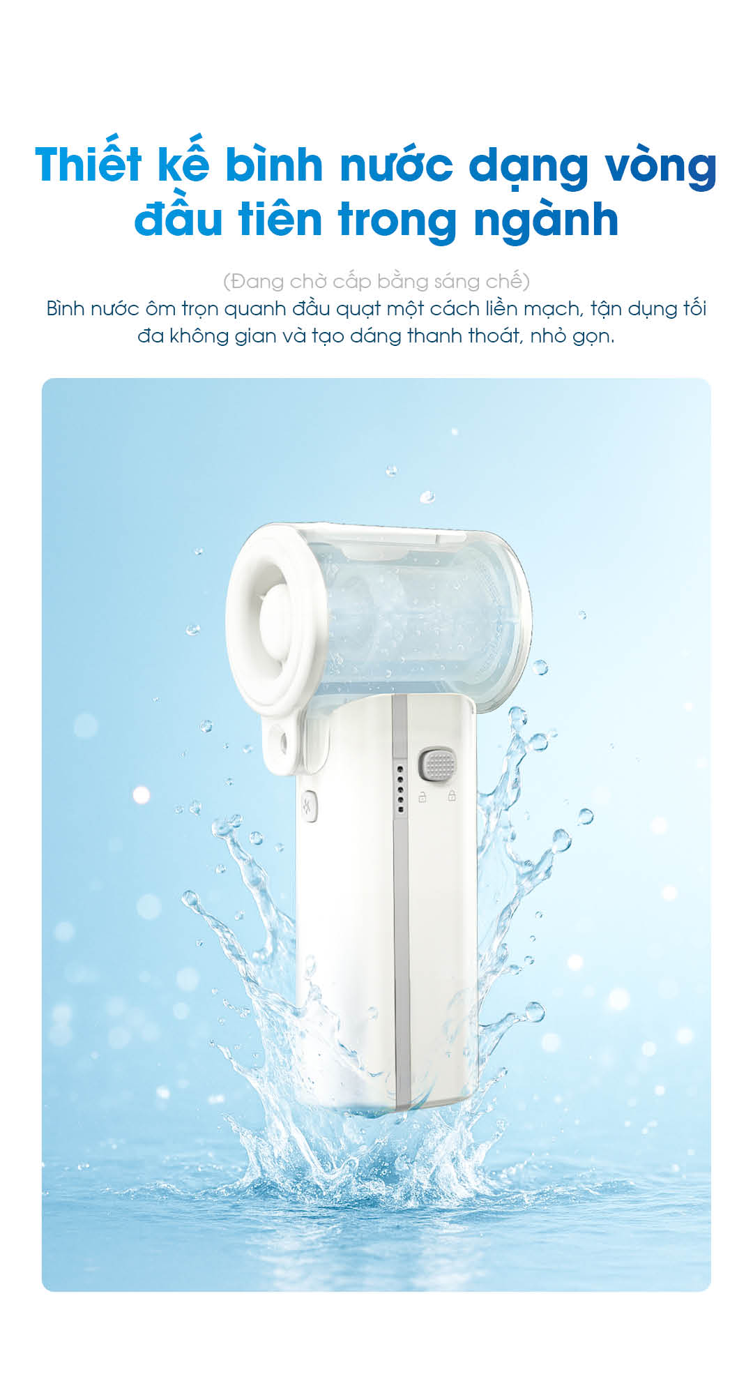 - Thiết kế bình nước dạng vòng quanh đầu quạt (độc đáo, gọn gàng).