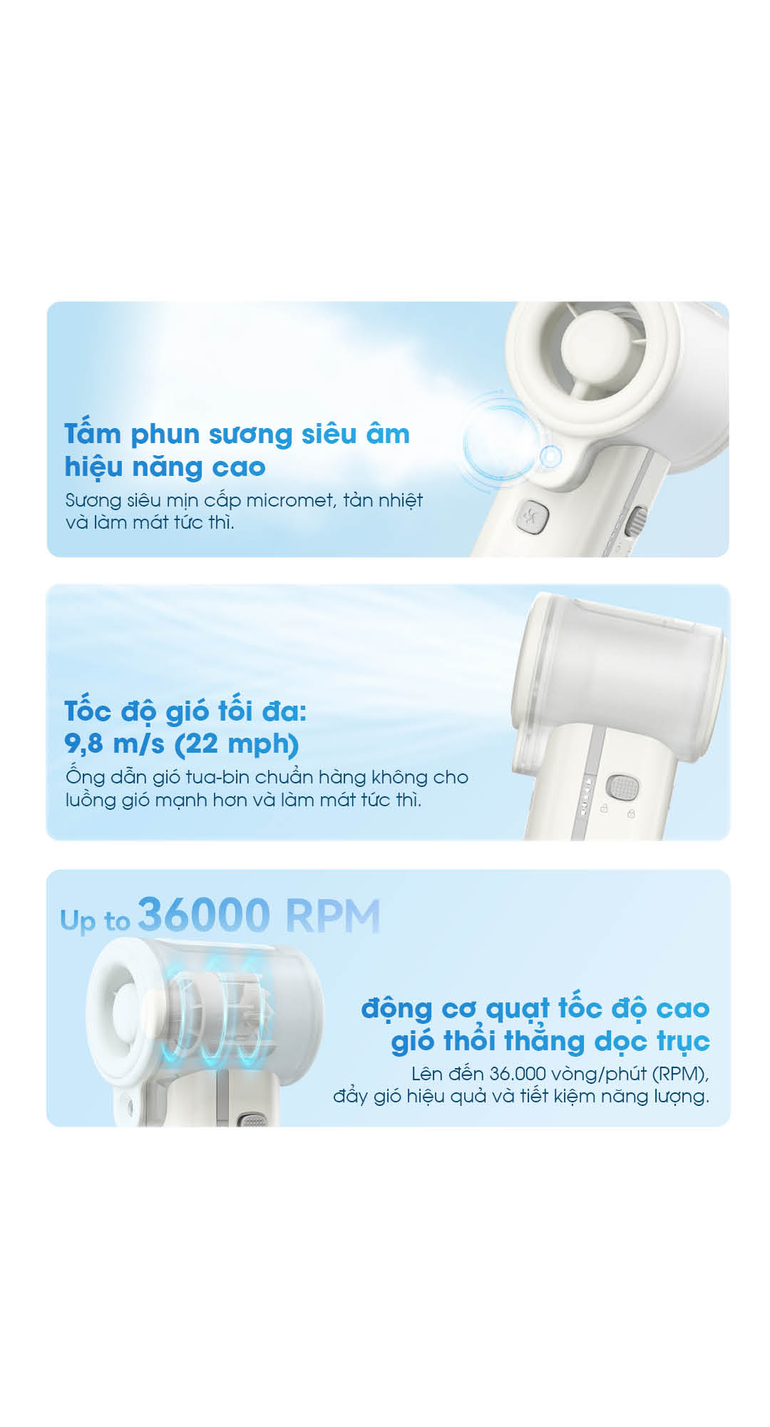 - Gió mạnh 9.8m/s, động cơ 36.000 RPM – gió thổi thẳng dọc trục, tập trung.