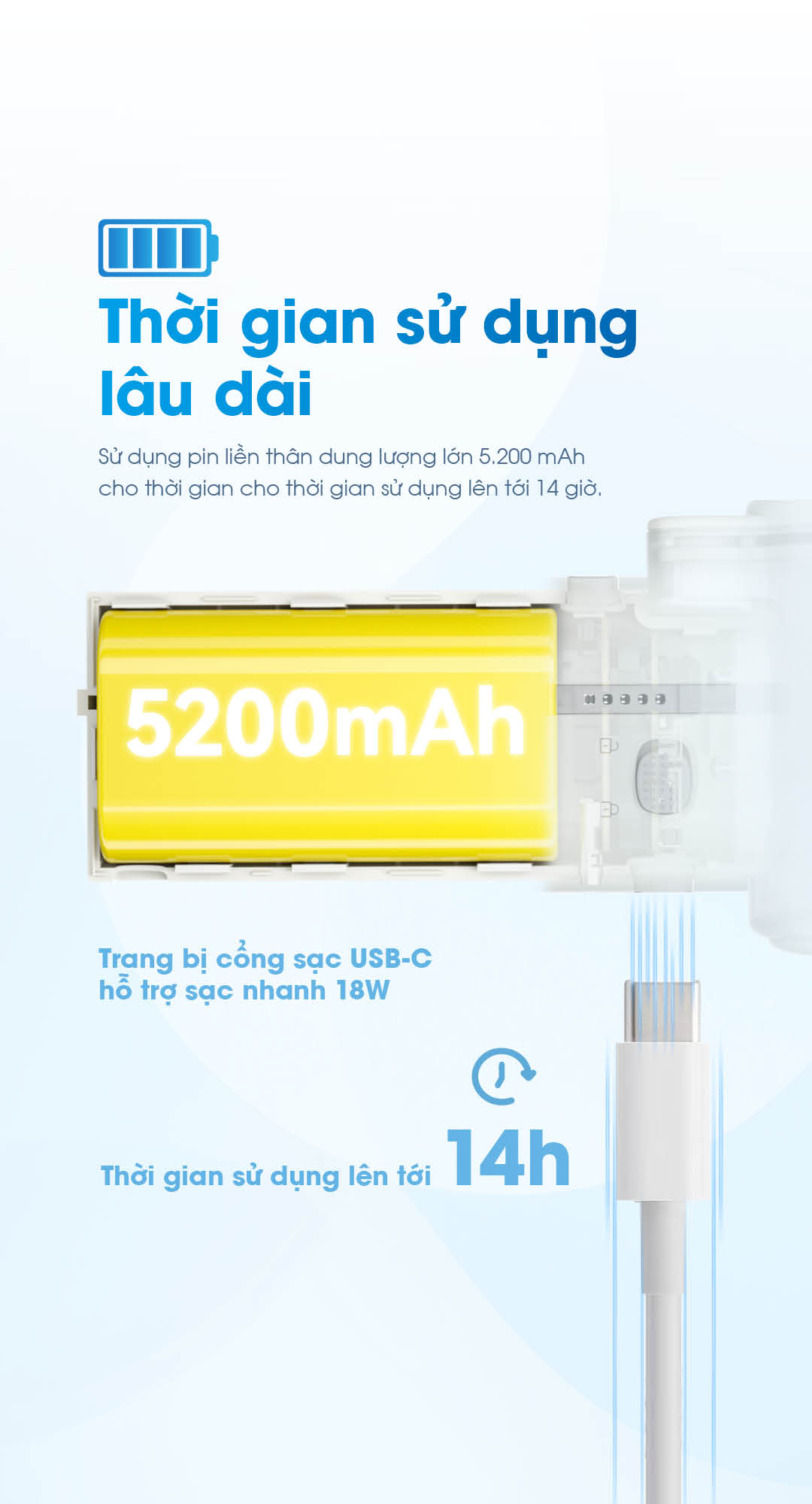 - Pin 5.200mAh – 14 giờ dùng tối đa; sạc nhanh 18W đầy khoảng 2 giờ (USB-C).