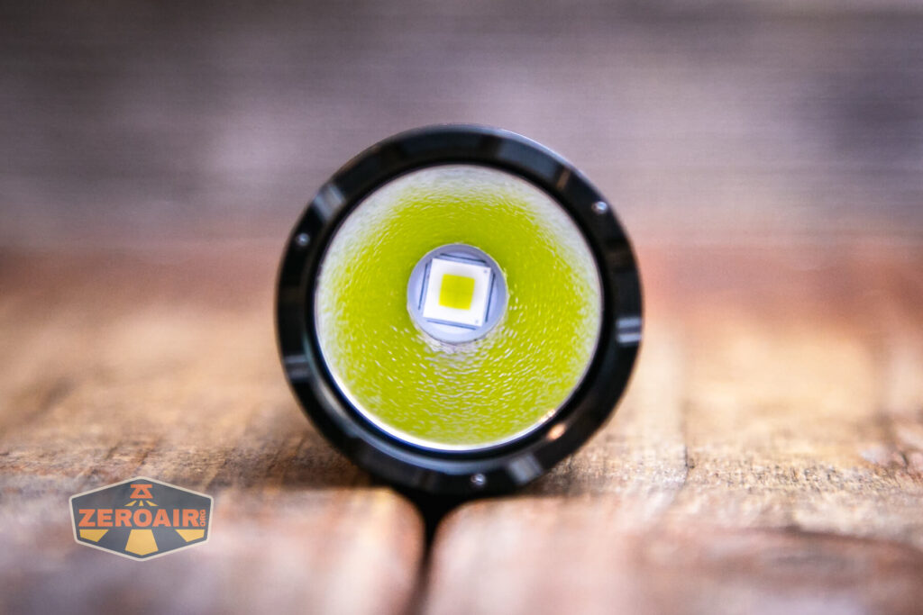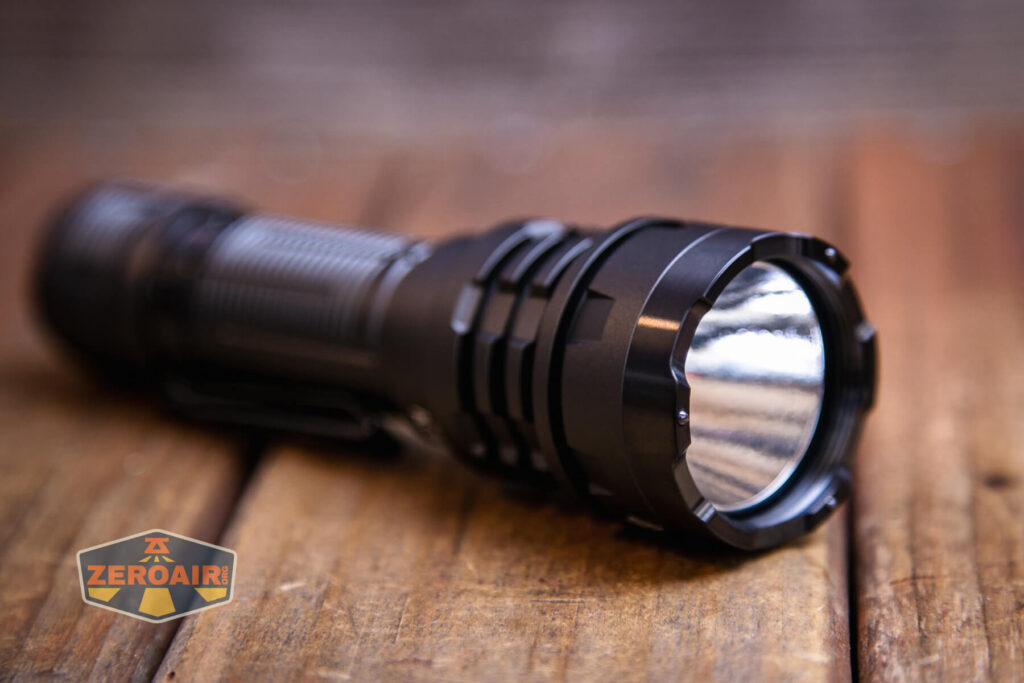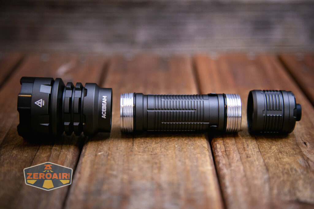 Phần đầu đèn có các rãnh tản nhiệt được gia công đứt quãng để làm gờ chống lăn. Thân đèn có thể tháo rời với phần đầu và có kích thước phù hợp với pin 21700.