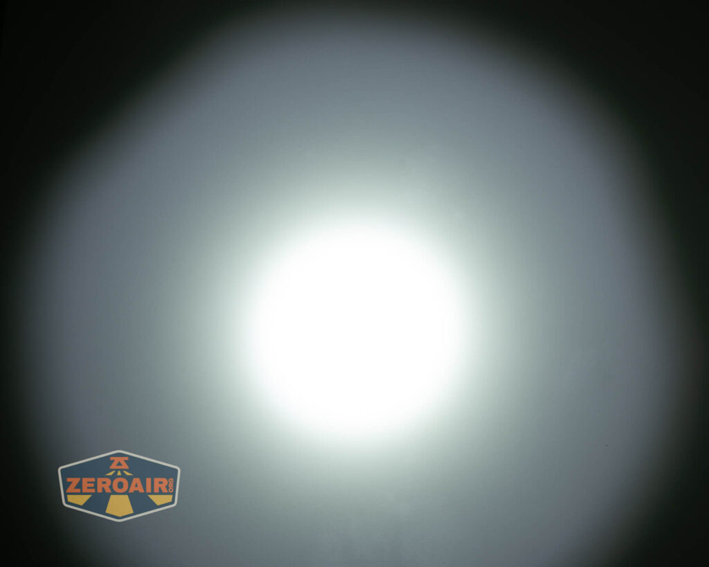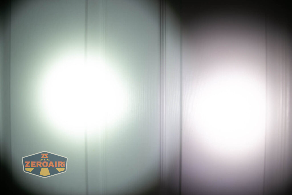 Tôi để đèn pin P17 ở bên trái và đèn pin tham chiếu BLF-348 ở bên phải. Dễ nhận thấy trong ánh sáng P17 có lẫn chút ánh sáng xanh mát khi so cùng ánh tím của BLF 348