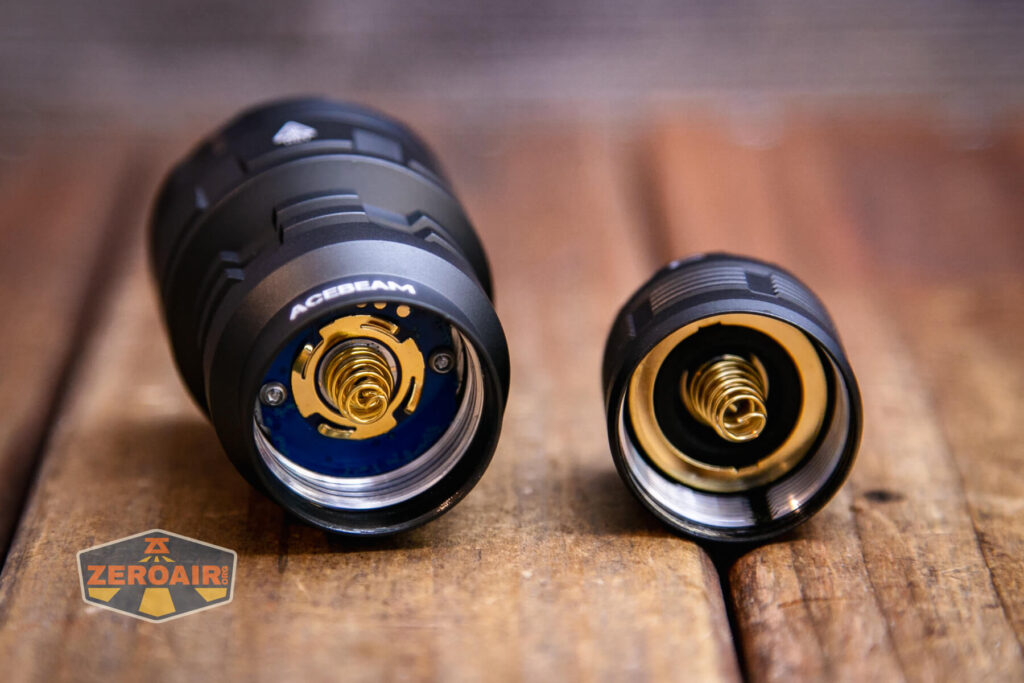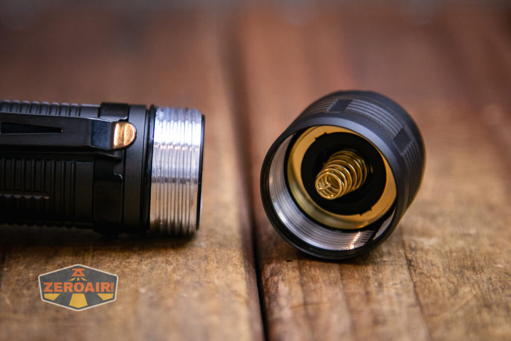 Phần ren đèn không được anốt hóa, cắt vuông vắn, bôi trơn tốt và khá dài. Thao tác tháo nắp đuôi khá mượt và dễ dàng. Đuôi đèn có trang bị lò xo được mạ vàng.
