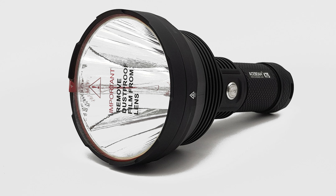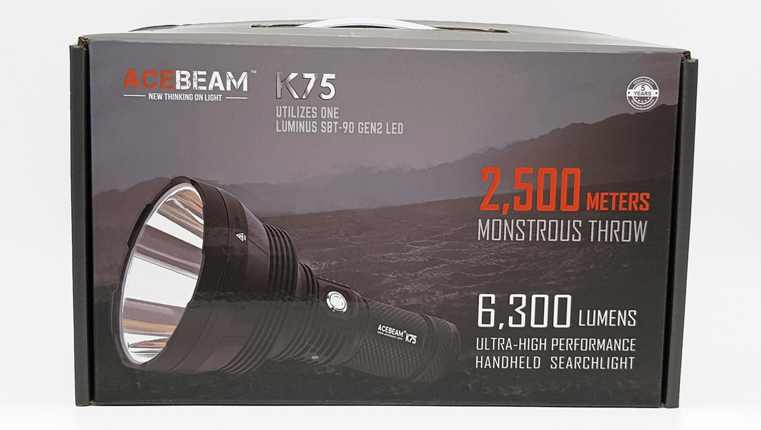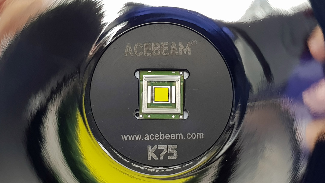 Acebeam K75 hiện là cây đèn pin LED chuyên nghiệp hàng đầu thế giới về hiệu suất cao, tổng độ sáng và tầm chiếu xa vô địch. Đèn sử dụng bóng Led LUMINUS SBT 90 GEN2, cấp năng lượng bằng 4 pin Li – ion 18650, phát ra ánh sáng 6300 Lumen với tầm chiếu xa tối đa 2500m và cường độ nguồn sáng đỉnh 1.562.500 candela. Đây là thông số tôi đánh giá là khủng nhất hiện nay, tôi chưa thấy đèn của hãng nào khác đạt được.