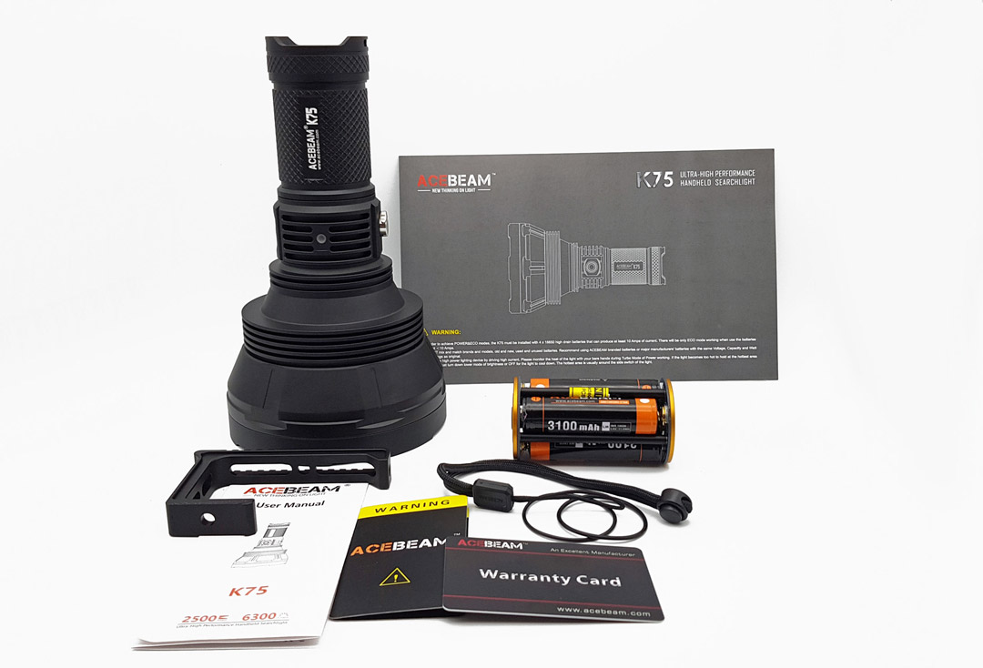 Hộp đèn bao gồm một cây đèn Acebeam K75, tay cầm, dây đeo, bốn pin ARC 18650H – 3100mAh, hướng dẫn sử dụng, hai gioăng cao su thay thế và thẻ bảo hành.