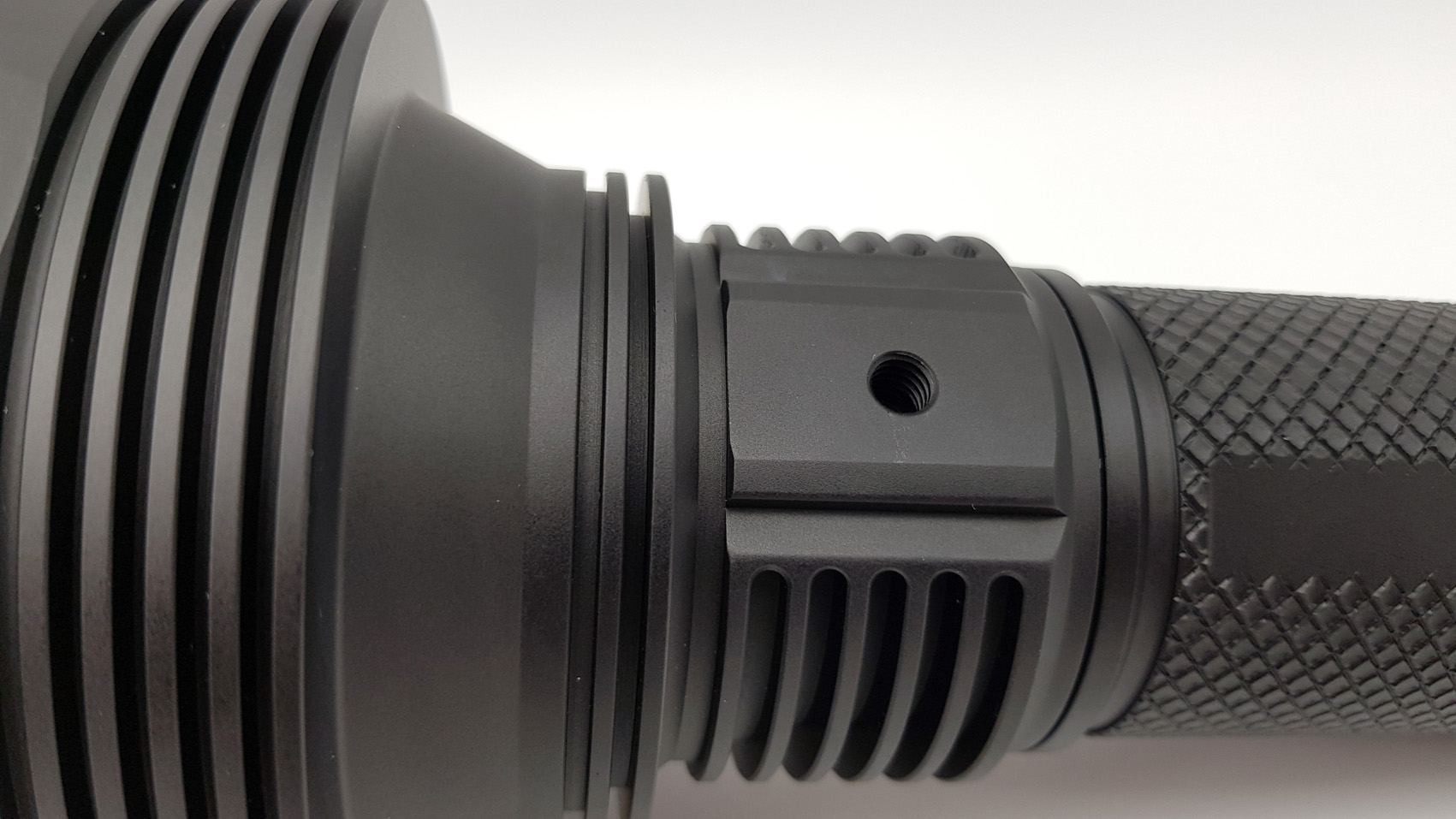 Phần thân K75 có các vân hình thoi giúp tăng ma sát khi cầm nắm. Chúng được gia công chính xác cùng các vòng ren xoắn kết nối thân đèn với đuôi đèn và đầu đèn. Phía trên tay cầm khắc tên thương hiệu, tên đèn, số seri.