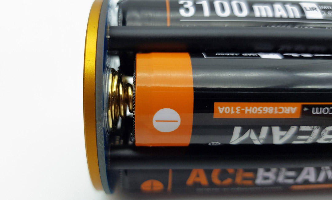 Acebeam K75 đc cấp năng lượng từ 4 pin Li - ion 18650 được lắp trên khay pin. Lò xo mạ vàng, các phần tiếp xúc cũng được mạ vàng tăng khả năng dẫn điện và thời gian sử dụng. K75 có khả năng đứng tốt bằng đuôi.