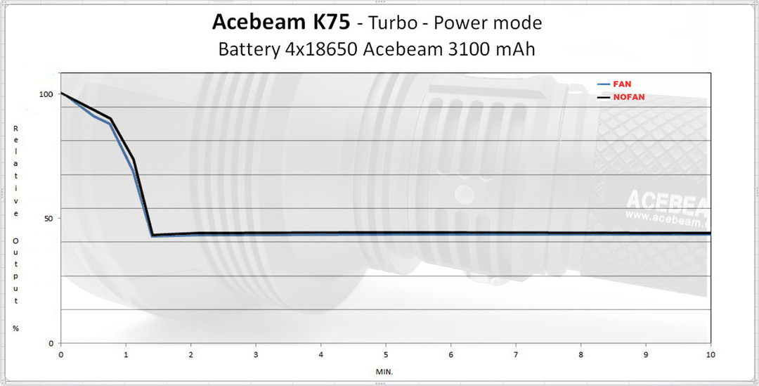 Cuối cùng, chế độ Power không làm mát, đồ thị thử nghiệm bao gồm cả nấc sáng HIGH (2500lm).
