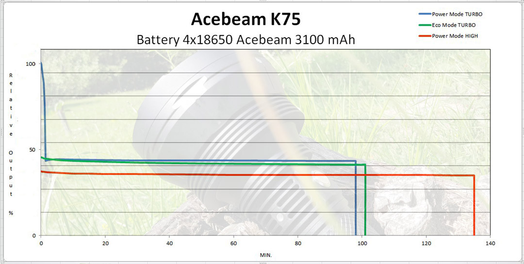 Lưu ý: Để sử dụng chế độ ECO&POWER, K75 cần lắp 4 pin 18650 dòng xả tối thiểu 10A. Nếu pin có dòng xả dưới 10A thì chỉ dùng được chế độ ECO.