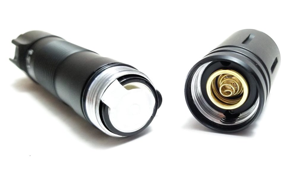 Để tháo ống thân và lấy pin, người dùng sẽ vận ống thân ở gần đầu đèn. Ren đèn và đầu vặn rất đều, được bôi trơn và mịn mà, không bị rít hay kẹt cho người dùng. Đèn trang bị loại lò xo đặc biệt để tiếp xúc với pin. Acebeam đã sử dụng hệ thống lò xo và các tiếp điểm thứ cấp để định hướng lưu lượng điện tử. Đầu lò xo được mạ vàng và thiết kế bên trong một vòng tiếp điểm nữa (cũng được mạ vàng). Phía lò xo ở đuôi cũng có một hệ thống lò xo tương tự, với một lò xo trung tâm và vòng ngoài. Lò xo kép trên đèn chuyên dụng (đặc biệt là gắn trên vũ khí) là rất quan trọng đối với độ bền và duy trì tiếp xúc liên tục dưới độ giật. Điều này làm nổi bật độ bền vì nó loại bỏ được các yếu tố hỏng hóc tiềm ẩn.