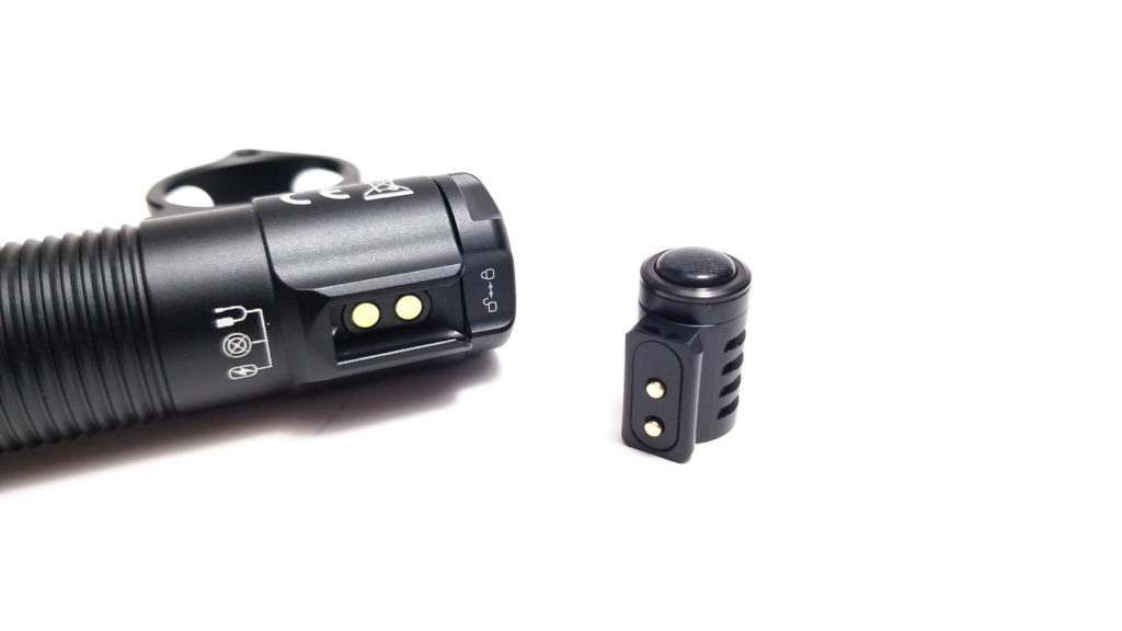 Cáp sạc, công tắc điều khiển từ xa và công tắc phản ứng nhanh đều tương tác với đèn qua cổng module ở đuôi đèn. Ở cổng module có 2 đầu tiếp điểm được mạ vàng giúp tăng hiệu suất truyền dẫn. Các phích cắm trượt kịch vào trong và khá an toàn, người dùng có thể khóa đầu cáp tại chỗ bằng cách xoay vòng khóa phía sau sang bên phải. Vòng khóa có một chốt gài nhẹ vào vị trí để giữ cho cáp sạc hay cáp dây điều khiển không bị mở khóa nếu bị chen lấn hoặc va chạm. Đây là một tính năng rất thông minh khi đèn được gắn vào một kh-ẩu sú-ng trư-ờng để chịu tác động của độ giật trong các tình huống chuyên dụng. Và qua một số bài test vật lý, tôi khẳng định vòng xoay khóa của đèn rất chắc chắn khi được cài hết vòng, cáp sạc không hề nhúc nhích.