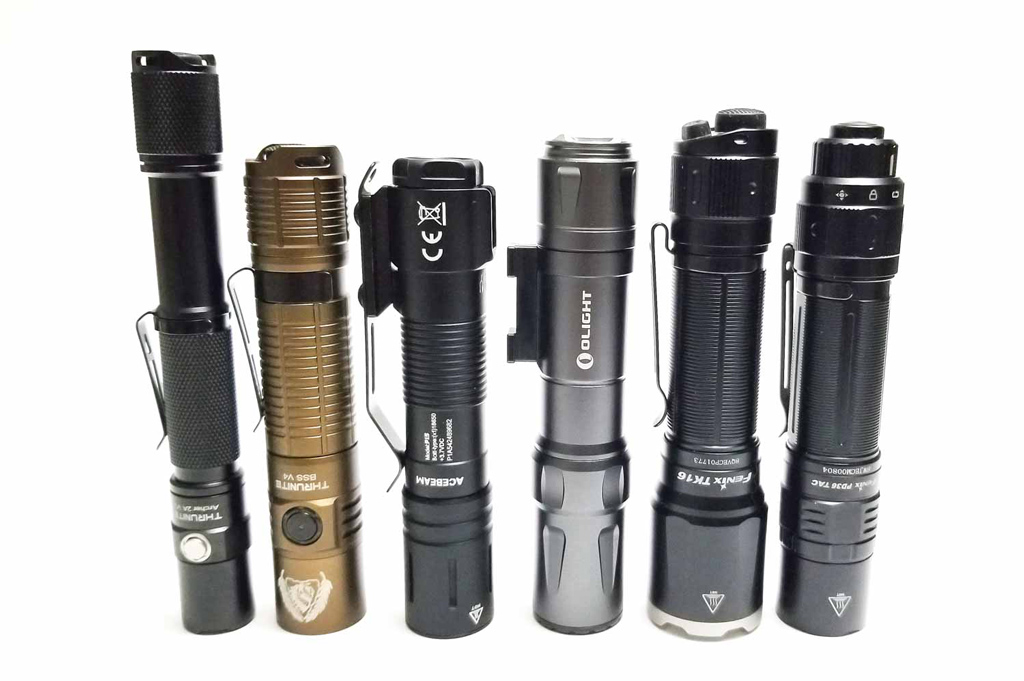 Ảnh 2 từ trái sang phải: Thrunite Archer 2A V3, Thrunite BSS V4, Acebeam P15 Defender, Olight Odin, Fenix TK16 V2, Fenix PD36 Tac.