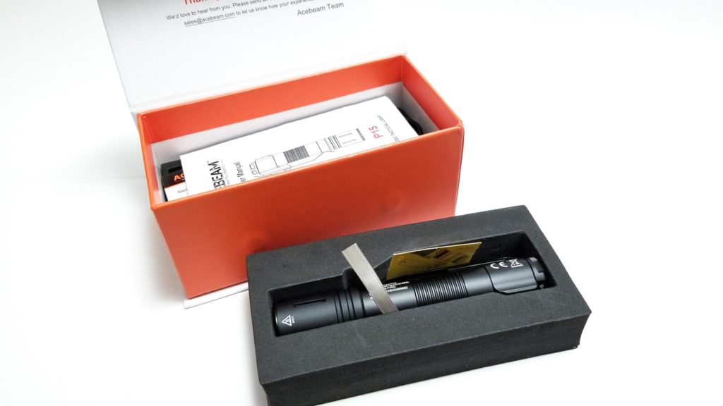 P15 có vỏ hộp đóng gói rất vuông vắn, cẩn thận và tỉ mỉ (đẹp như vỏ hộp của Olight). Hộp được thiết kế tiện dụng, với đầy đủ hình ảnh kích thước P15 ở mặt trước cộng với việc cán mờ nylon để làm bóng hộp. Nắp hộp khi mở lật được giữ bằng khóa từ tính ở thành hộp, rất hiện đại. Trong hộp, P15 được đặt nằm trên một khay xốp microcell cắt vừa vặn. Bên dưới khay là các phụ kiện khác. Và với những ai đặt thêm phụ kiện nữa, thì các phụ kiện ngoài của đèn cũng sẽ được cất dưới khay xốp của vỏ hộp.