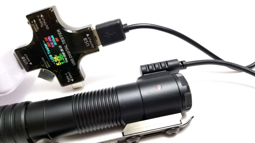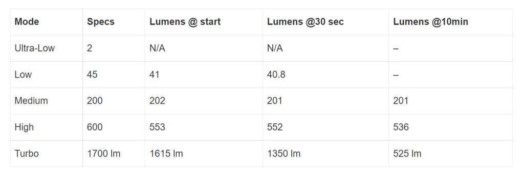 Tại thời điểm bắt đầu thí nghiệm, đèn sáng ở nấc Turbo đo được là 1615 Lumen và chỉ giữ nấc sáng đó trong khoảng 20 giây, rồi bắt đầu giảm xuống còn 1530 Lumens. Sau hơn 1 phút 30 giây khi ở nấc sáng 1300 Lumens, xuất hiện sự sụt giảm nấc sáng đầu tiên xảy ra vào lúc 1 phút 15 giây và đến 1 phút 30 giây, độ sáng bây giờ là 595 Lumens. Nhiệt độ môi trường xung quanh ban đầu là 24 độ C, sau 5 giây đầu tiên, đầu LED đạt 32,7 C. Sau 20 giây, đầu LED đạt là 46,7 C và sau 60 giây là 55,8 C. Tại 1 phút 30 giây đầu tiên, nhiệt độ giảm xuống 53 C và không bao giờ vượt quá 58 C. Khi đó, nấc sáng ổn định ở mức 595 lumen trong 38 phút tiếp theo và giảm nhẹ xuống 510 Lumens. Đèn giữ nguyên nấc 510 lumen trong khoảng một giờ. Cho đến mốc 2 giờ 1 phút, đèn giảm công suất xuống dưới 200 Lumens, sau đó giảm xuống dưới 100 lumen ở khoảng 30 giây sau đó và sau đó tắt thang đo lux. Máy đo được kết quả thấp nhất cho nấc sáng là 7 lumen, nhưng đó là giới hạn của máy đo chứ không phải là kết quả thực tế, bài kiểm tra kết thúc sau 2 giờ 3 phút. Pin chỉ đọc 2,58 volt sau bài kiểm tra, hơi thấp và mức xả khá sâu đối với pin lithium-ion, nhưng vẫn nằm trong giới hạn an toàn.