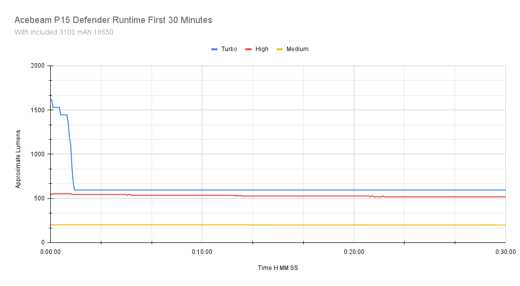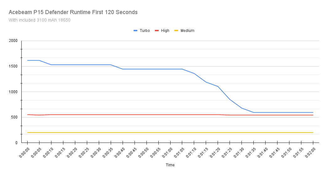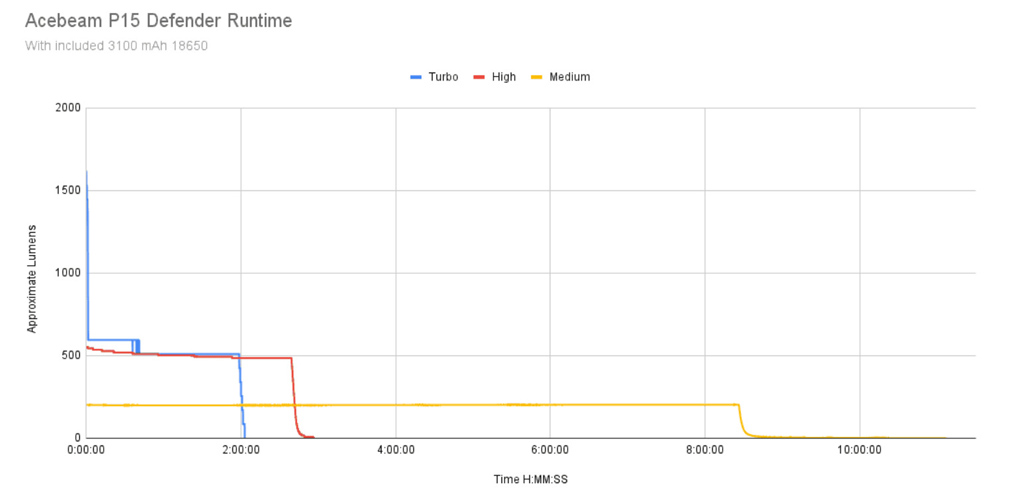 Nấc sáng High khi bắt đầu thí nghiệm đo được là 552,5 lumen và ổn định trong gần như toàn bộ quá trình thí nghiệm. Gần như đèn không bị hạ sáng xuống dưới 500 Lumens cho đến khi đèn sáng được 1 giờ 24 phút sau. Nhiệt độ đèn cũng rất ổn định. Tại thời điểm 1 tiếng sau khi test, máy đo được 49 độ C ở đầu đèn. Ánh sáng hạ dần còn 485 Lumens sau 1 giờ 25 phút, sau đó giảm một chút xuống khoảng 400 Lumens, và sau đó giảm dần trong 3 phút tiếp theo xuống dưới 100 Lumens. Đến 2 giờ 44 phút, độ sáng đèn giảm xuống dưới 10 Lumens và tắt lúc 2 giờ 56 phút. Theo như Acebeam công bố, đèn có thể được 2 giờ 45 phút. Vậy là trên thực tế, đèn có thể tương đương vậy, thậm chí là hơn.