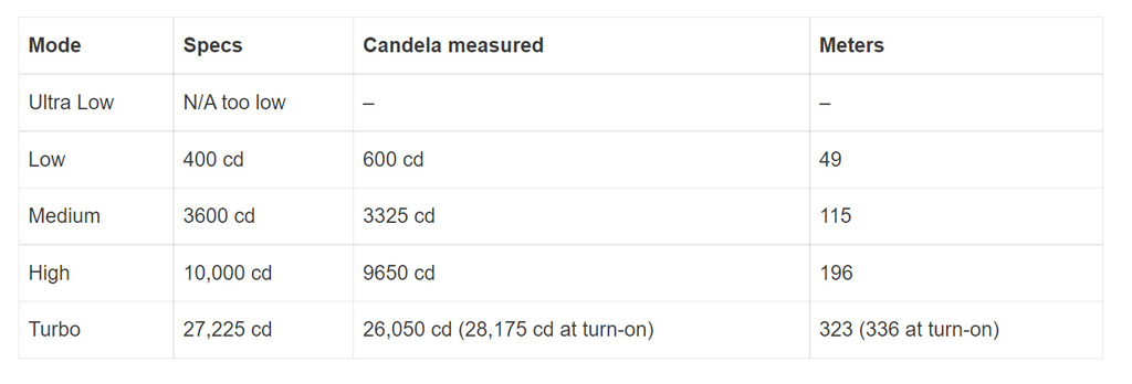 Thí nghiệm được đo bằng cách chiếu sáng lên mặt phẳng xa 5 mét trong nhà bằng máy đo lux Uni-t UT383S. Đèn sử dụng pin ARC18650H-310A đã được sạc đầy để thử nghiệm. Các kết quả được ghi lại ở giây thứ 30.