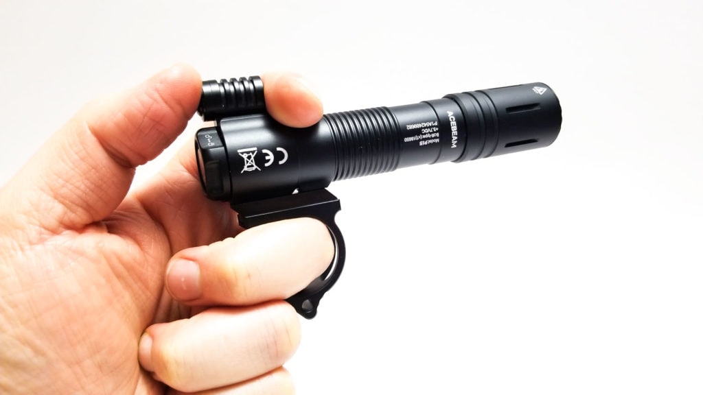 ACEBEAM P15 có một công tắc điện tử ở phía đuôi, được gia công hoàn toàn bằng hợp kim nhôm với bề mặt nhẵn (không bóng lóa). Mặc dù nút công tắc được thiết kế rất phẳng nhưng lại không gây khó khăn trong sử dụng. Thao tác bấm rất đơn giản, siêu nhạy, không giống như một số công tắc điện tử ở các đèn khác hay bị chập chờn hay không được nhạy, … Thao tác nhanh gọn, dễ dàng kích hoạt và tiếp cận bằng ngón tay cái ở tư thế thuận tay hoặc khi được sử dụng với vòng nắm chiến thuật. Ngoài ra ở phần đuôi, còn có thể lắp thêm công tắc phản ứng nhanh. Đây là một công tắc điện tử khác có thể tháo rời cho phép người dùng truy cập chế độ Strobe tức thì. Công tắc này thao tác sẽ dễ dàng hơn nhiều khi người dùng cài thêm vòng tác chiến nhằm cầm thuận chiều tay
