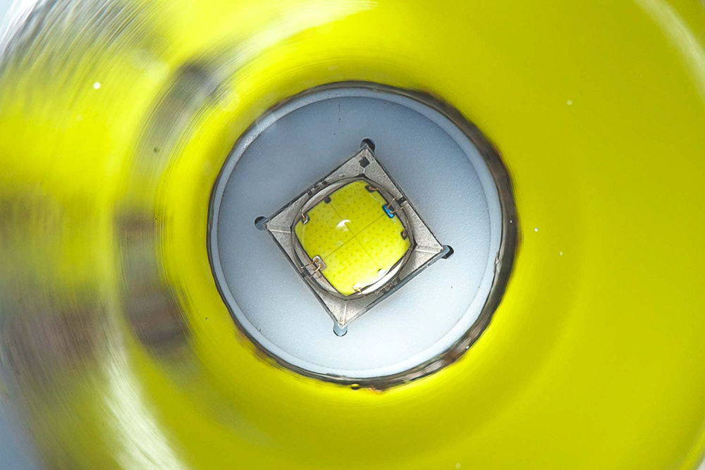 Từ phía trước của đầu đèn, người dùng có thể nhìn thấy một thấu kính thủy tinh cường lực siêu trong và chóa phản xạ trơn và mịn. Sâu bên trong chóa đèn là một LED được lắp đặt và căn giữa một cách hoàn hảo với vòng định tâm màu trắng ở đầu đèn. LED ở đầu đèn là LED Luminus SST70 và tôi đã sử dụng máy đo Opple Light Master III để đo nhiệt màu (CCT) và độ hoàn màu CRI, và đây là kết quả: 5300K và 63 CRI. Tuy kết quả không thật sự chính xác nhưng độ hoàn màu của C7 chắc chắn dưới 70