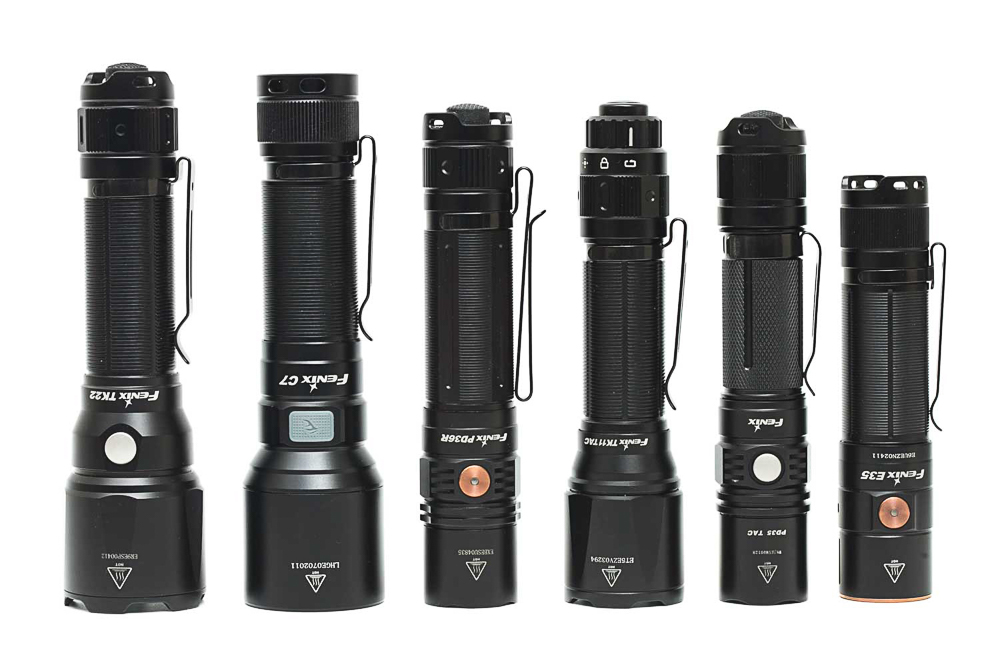 Từ trái qua phải: Fenix TK22 v2, Fenix C7, Fenix PD36R, Fenix TK11TAC, Fenix PD35 TAC, Fenix E35 v3.