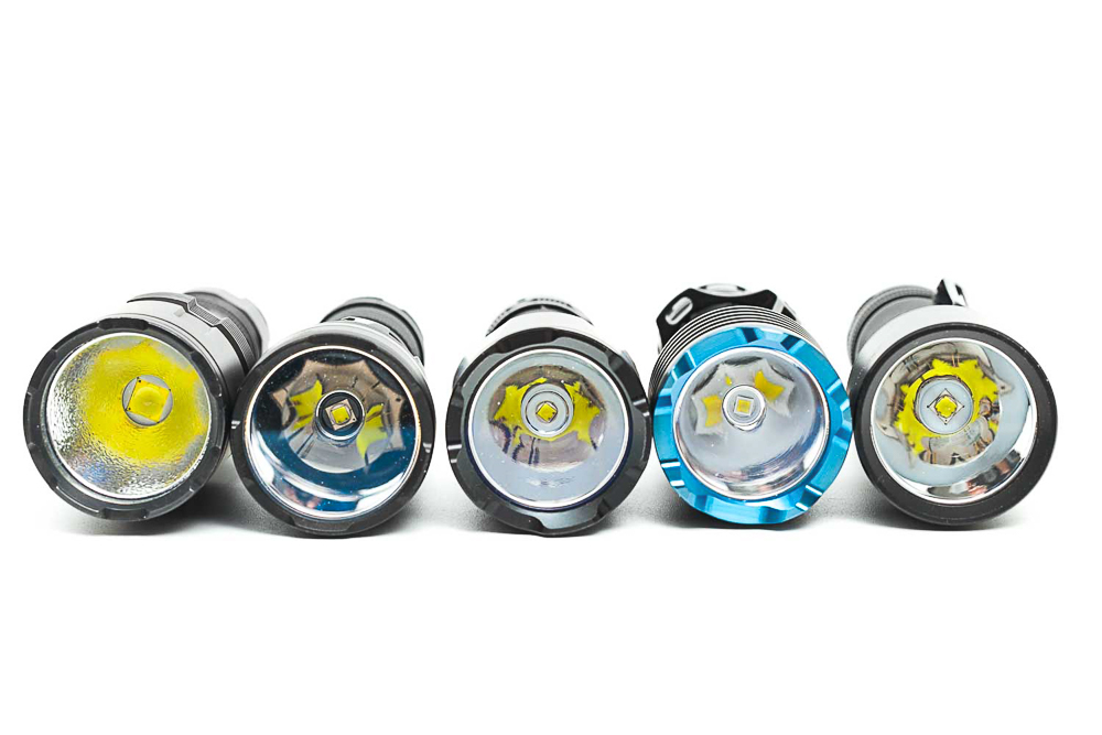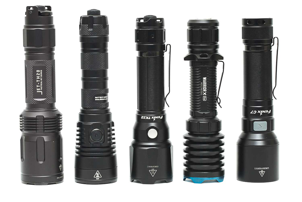 Từ trái qua phải: Jetbeam Jet TH20, Nitecore MH12S, Fenix TK22 v2, Olight Warrior X Pro, Fenix C7.