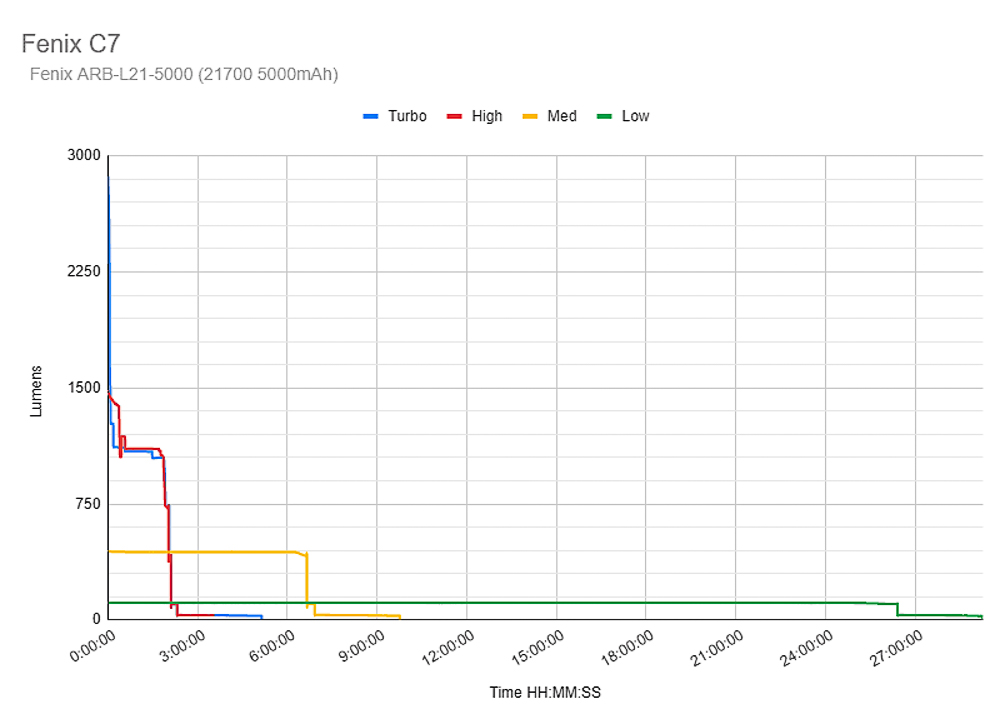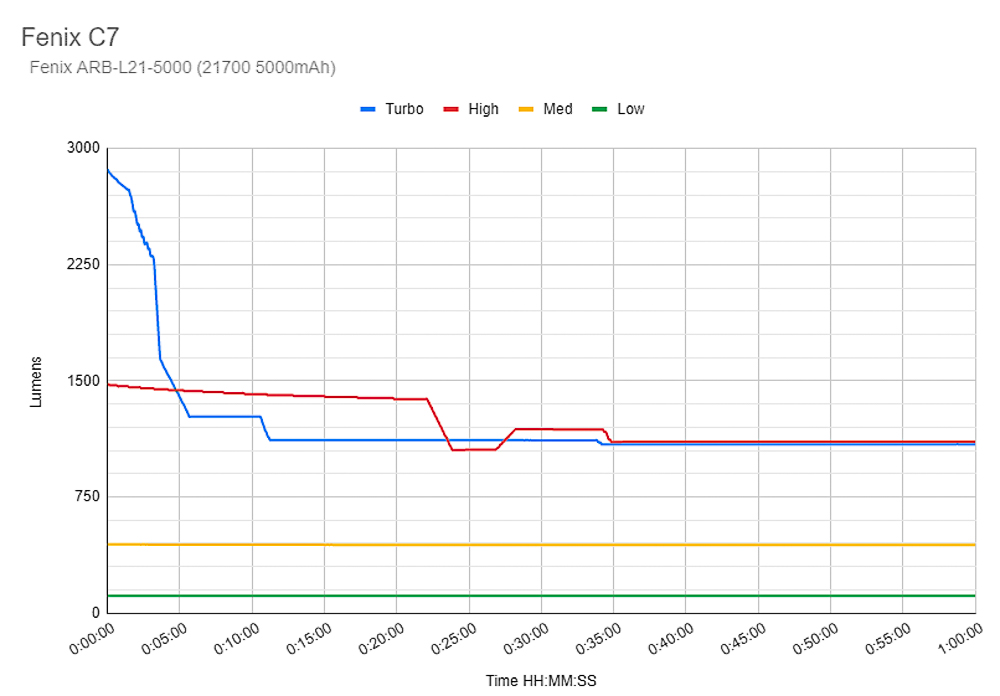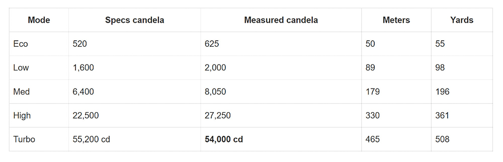 Nấc sáng Turbo: đèn bắt đầu sáng khoảng 2900 lumen và bắt đầu giảm từ từ. Đúng sau 6 phút, công suất đèn giảm còn khoảng 1270 lumen. Ở phút thứ 34, đèn giảm độ sáng 2 lần nữa, độ sáng duy trì ở mức 1090 lumen. Sau 1 giờ 50 phút, độ sáng bắt đầu giảm nhanh chóng còn 400 lumen, (chúng tôi khuyên trong thời điểm này, người dùng nên sạc hoặc thay pin). Tại thời điểm 2 giờ 7 phút, công suất đèn giảm từ khoảng 400 lumen xuống còn 100 lumen và có dấu hiệu hết pin. Tại thời điểm đó, đèn pin vẫn chưa tắt hoàn toàn. Đèn sẽ duy trì nấc sáng siêu thấp, thời điểm thật sự cạn kiệt pin là 5 giờ 8 phút. (Thông số kỹ thuật mà hãng công bố với nấc Turbo chỉ là 1 giờ)