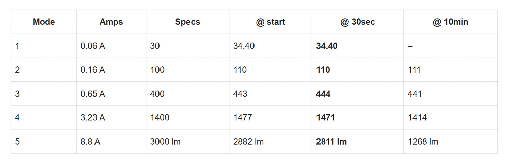 Tất cả các kết quả thí nghiệm đều từ máy đo tích hợp tự chế, được thiết lập với Máy đo Lux mở rộng SDL400 cho các phép đo bao gồm bộ lọc Kenko PRO1D ND-16. Phép đo cơ bản được thực hiện với Convoy S2 + đã được thử nghiệm ở 255 lumen.