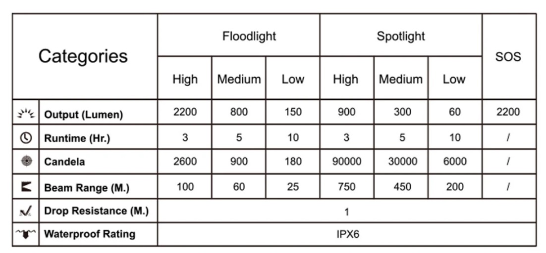 - Khả năng chống nước IPX6: Đèn có khả năng chống nước, phù hợp cho các hoạt động ngoài trời ngay cả trong điều kiện thời tiết xấu.