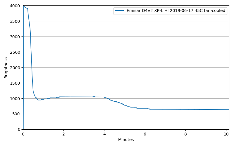 So với D4 thì việc điều chỉnh nhiệt độ trên D4V2 dễ hơn nhiều. D4V2 có xu hướng tìm đến một nấc sáng sao cho nhiệt độ ổn định, nó không có xu hướng nhảy quá nhiều nấc sáng. Dưới dây là biểu đồ khi tôi đo độ sáng của D4V2 trong 10 phút.