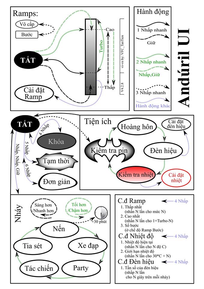 Những thao tác cơ bản: nhấn để tăt bật, giữ để thay đổi độ sáng. Phức tạp hơn chút ta sẽ đi vào giao diện sử dụng Anduril UI