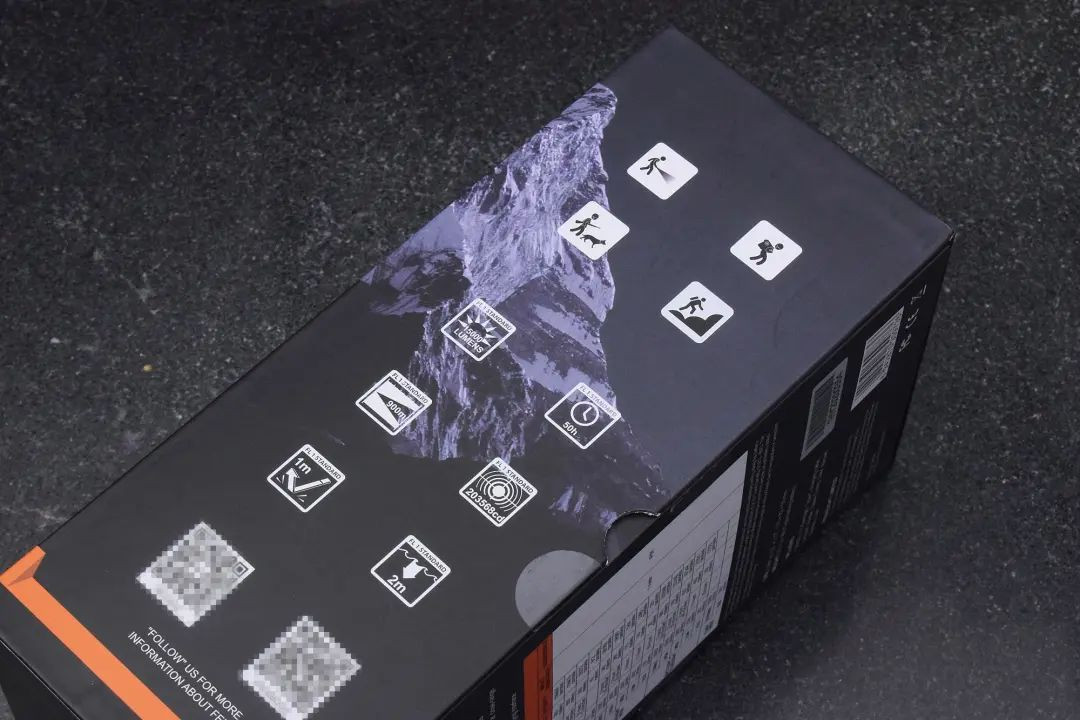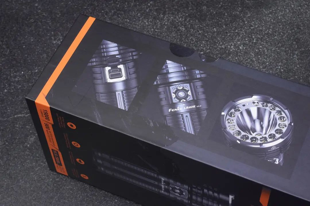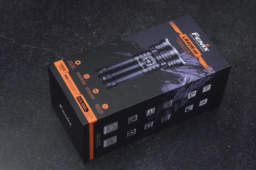 Đèn pin được thiết kế bao bì theo form bìa cứng, với thiết kế hình minh họa rất đẹp, tông màu chủ đạo là đen và cam. Nhãn màu đỏ bên dưới được in dòng chữ bắt mắt "15000" và "900", lần lượt thể hiện độ sáng cao nhất và tầm chiếu xa nhất của LR40R V2.0.