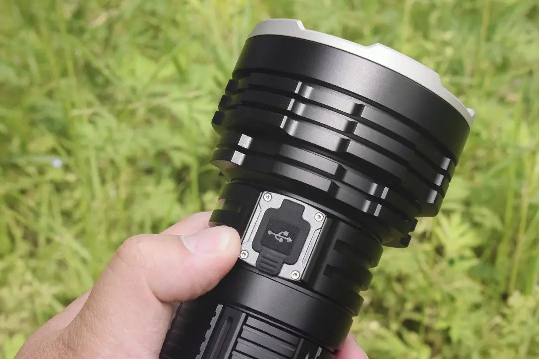 Nắp đậy cổng sạc vẫn có độ kín khí rất tốt, chặt chẽ và không lỏng lẻo, nó có thể đóng vai trò chống thấm nước rất tốt và cũng dễ dàng rút ra bằng một tay. Bốn góc của mô-đun sạc được cố định bằng bu lông, tạo thêm kiểu dáng cứng cáp cho toàn bộ đèn pin.