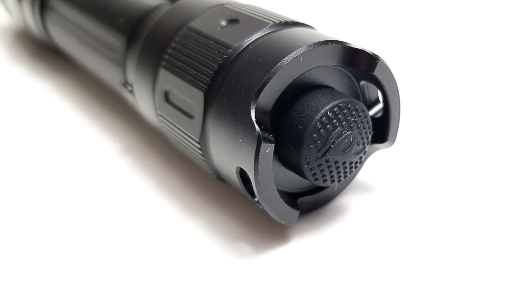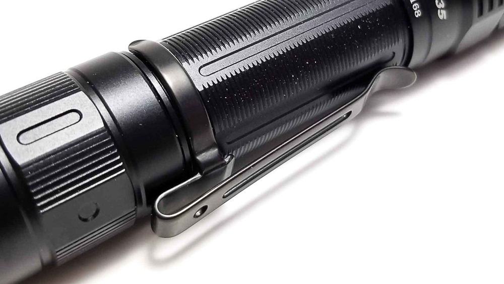 Sự sắp xếp thiết công tắc điện tử và công tắc nhấp nháy ở đuôi được chuyển tiếp các mẫu PD35 trước đó rất thông minh và dần dần đặc điểm này càng trở nên phổ biến với các đèn Fenix. Công tắc thân của đèn có LED báo pin hiển thị trạng thái pin, nhưng chỉ trong 3 giây đầu tiên sau khi đèn được kích hoạt: Màu xanh lục là 100-85%, màu xanh lục nhấp nháy là 85-50%, màu đỏ là 5-25% và nhấp nháy màu đỏ là 5-1%. Công tắc thân nhô ra một chút và nằm ở vị trí giúp người dùng dễ dàng tìm thấy bằng cảm giác ngón tay. Công tắc chính cần lực bấm mạnh chút để thao tác. Ngược lại, công tắc phụ lại siêu nhạy và thao tác dễ dàng. Nắp đuôi có hai lỗ để luồn dây buộc đi kèm. Clip gài được gắn rất chắc chắn và khá “cầu kỳ” để tháo ra. Clip gài bám rất chắc và tốt hỗ trợ cài túi quần túi áo.