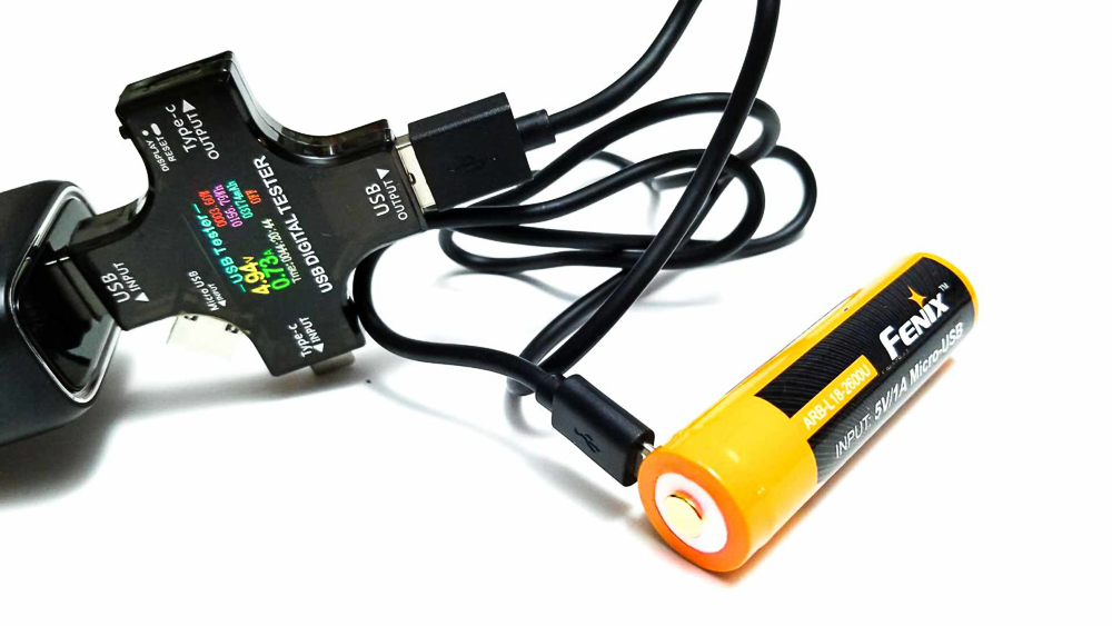Cáp sạc và cổng sạc ở trên thân pin là loại Micro USB, không phải là Type-C. Tuy sạc Type-C là loại sạc hiện đại và chất lượng cao vào thời điểm bây giờ, nhưng việc thiết kế cổng sạc như vậy lên pin có thể làm gia tăng chi phí sản xuất pin và giá thành sản phẩm. Dù sao, sản phẩm pin của Fenix cũng được bảo hành 1 năm lận, nên người dùng gần như không phải lo lắng về chuyện hỏng pin sạc. Tốc độ sạc pin của đèn thường ở mức 1 amp, qua kiểm tra, chỉ số cường độ dòng điện chỉ hiển thị 730 mA trên thiết bị 3,7 volt. Như vậy sạc của Fenix cũng không phải là sạc nhanh. Có một đèn LED SMD nhỏ là đèn báo sạc có màu đỏ (đang sạc) và màu xanh lam (sạc đầy). Pin đầy tương đương với điện áp ở mức 4,17-4,18 volt.