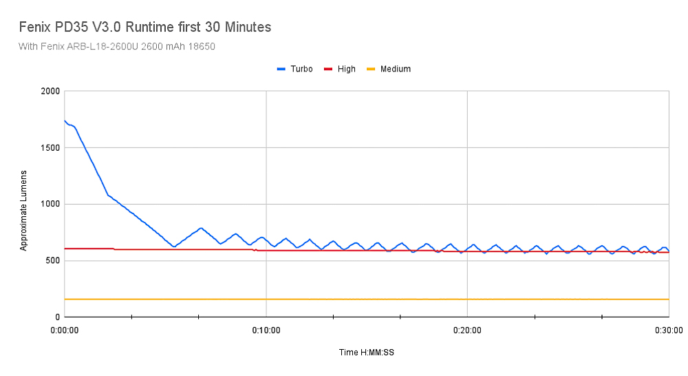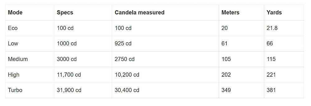 Đây là điểm phân biệt giữ đèn pin chuyên nghiệp và đèn giá rẻ, … Kết quả dưới đây hoàn toàn làm chúng tôi ấn tượng. Bài thử nghiệm đã đo lường các nấc sáng Turbo, High và Middle bằng cách sử dụng pin 2600 mAh đi kèm. 2 nấc sáng Low và Eco không kiểm tra được vì thời gian thử nghiệm sẽ không đủ.