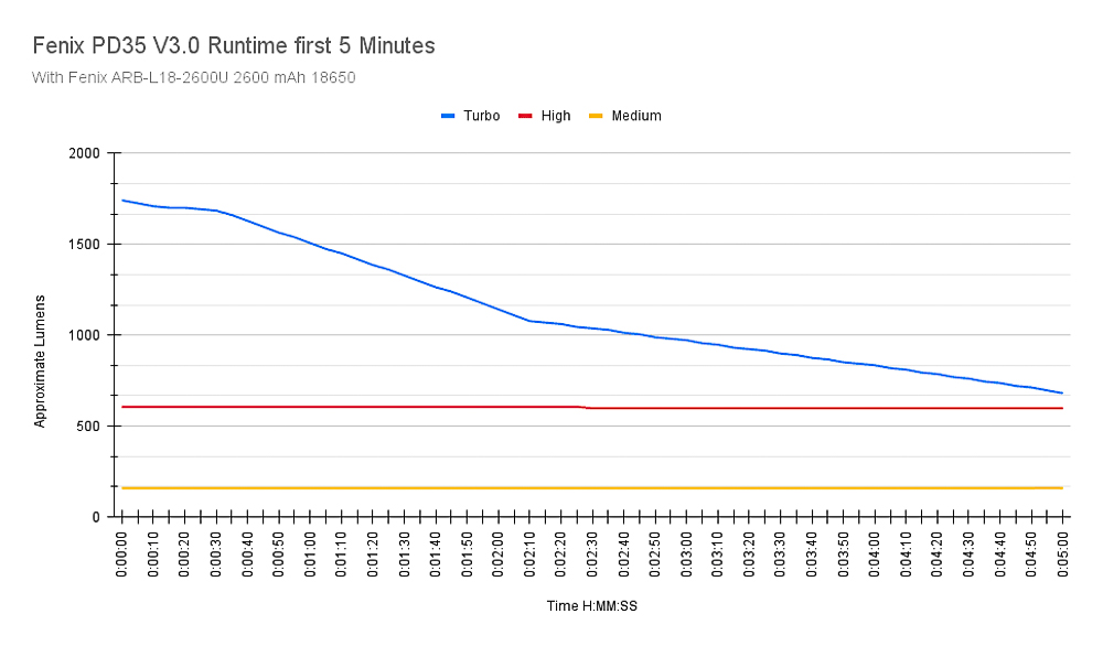 Ở bài thử nhiệm nấc sáng Turbo, đèn bật Turbo ở độ sáng 1740 Lumen và vì đèn không có nhiều lá tản nhiệt hay hệ thống quạt tản nhiệt, nên đèn hạ sáng xuống sau 20 giây chiếu sáng, còn khoảng 1692 Lumens sau 25 giây. Trên thực tế, độ sáng của đèn duy trì trên 1500 Lumens trong hơn một phút, vậy là rất sáng so với mong đợi. Mặc dù đèn nóng lên nhanh chóng, nhưng giới hạn nhiệt của đèn là ở 51 C, nên sau 90 giây, đèn dần dần hạ sáng xuống. Công suất đèn duy trì trên 1000 Lumens trong gần 3 phút trước khi giảm dần xuống còn 700 Lumens. Đây là điểm thú vị và cơ chế điều chỉnh nhiệt hoạt động của Fenix, Fenix điều chỉnh độ sáng để giữ nhiệt độ ổn định. Tuy nhiên, việc thay đổi nấc sáng sẽ không đột ngột như một số mẫu đèn rẻ tiền. Nhờ đó mà người dùng sẽ không nhận ra độ sáng đã bị giảm. Sau 1 giờ 54 phút, độ sáng hạ xuống còn 129 Lumens, và sau đó khoảng 4 - 5 phút. Đèn chính thức hết điện và tắt lúc 2 giờ 1 phút. Theo như thông số kỹ thuật của Fenix là 1 giờ 25 phút. Đầu đèn chưa bị vượt quá 51 C và có thể cầm được bằng tay trong suốt thời gian chiếu sáng.
