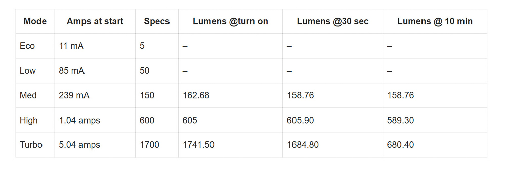 Độ sáng lumens được đo bằng quả cầu tích hợp 30 cm đã được hiệu chỉnh với một số đèn có công suất vừa như Convoy S2 + và Makkua. Kết quả được dùng từ máy đo độ sáng dữ liệu Digi-Sense 20250-00. Pin Fenix 2600 mAh đã được sạc đầy để làm thử nghiệm. Amps được đo bằng đồng hồ vạn năng Radio Shack T-RMS với 16 dây đo được cắm vào đồng hồ cho dòng điện dưới 8 ampe.