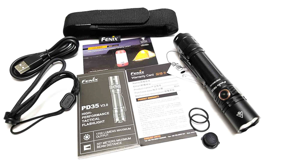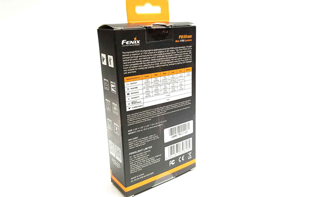 Bộ hộp bao bì đóng gói của Fenix là khá giống nhau và bao bì của hộp sản phẩm PD35 V3.0 có bố cục hấp dẫn, đẹp mắt và hoàn toàn hài hòa. Bộ sản phẩm rất phù hợp với cửa hàng bán lẻ vì có thẻ treo và hình ảnh ánh sáng bóng ở mặt trước với nhiều tính năng và thông số kỹ thuật. Tông màu quen thuộc của Fenix là cam và đen. Ở mặt sau là bảng thông số kỹ thuật và bảng đo thời lượng pin quen thuộc cho mỗi chế độ sáng. Tất cả vật liệu và phụ kiện đều đạt tiêu chuẩn sản phẩm cao cấp. Bên trong hộp, đèn được đặt trong một khuôn nhựa đúc với các phụ kiện được đặt bên dưới. Hộp đựng có một nắp bản lề che các phụ kiện bên dưới để giữ chúng không bị đổ ra ngoài khi người dùng kéo hộp đựng ra. Tuy chỉ là những tiểu tiết nhỏ nhưng rất tinh tế. Bộ sản phẩm đầy đủ bao gồm: