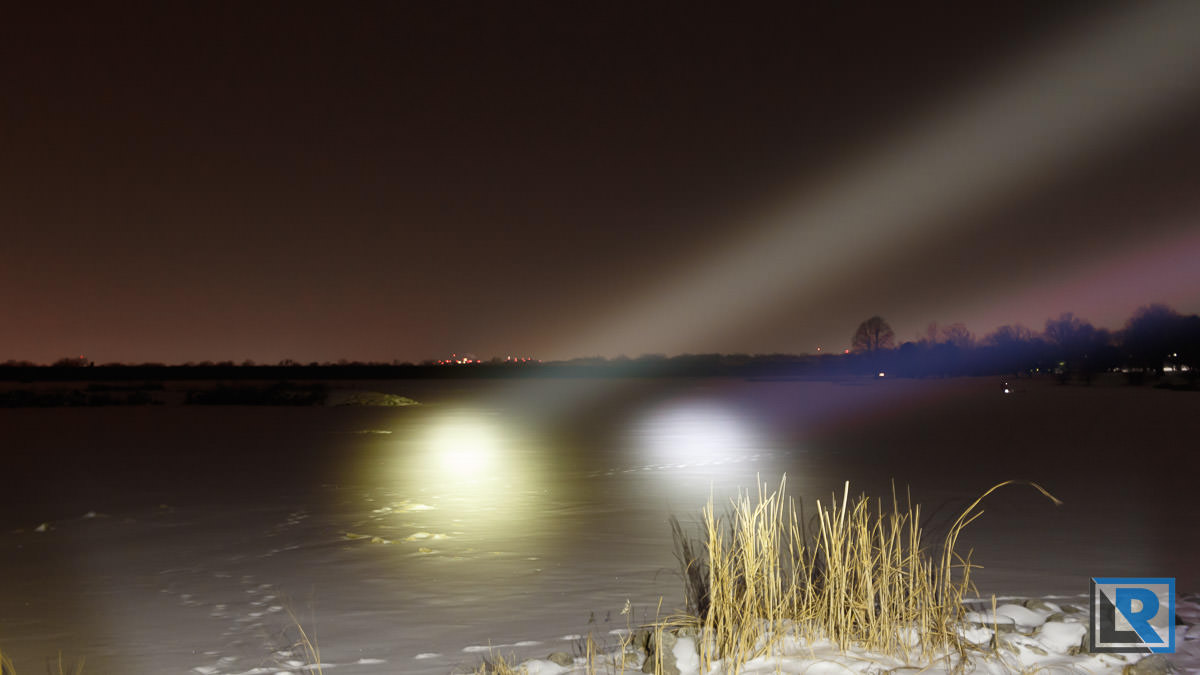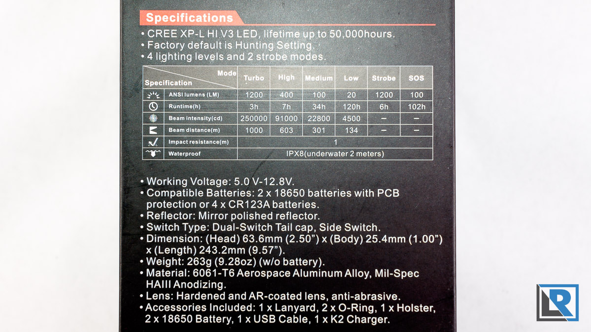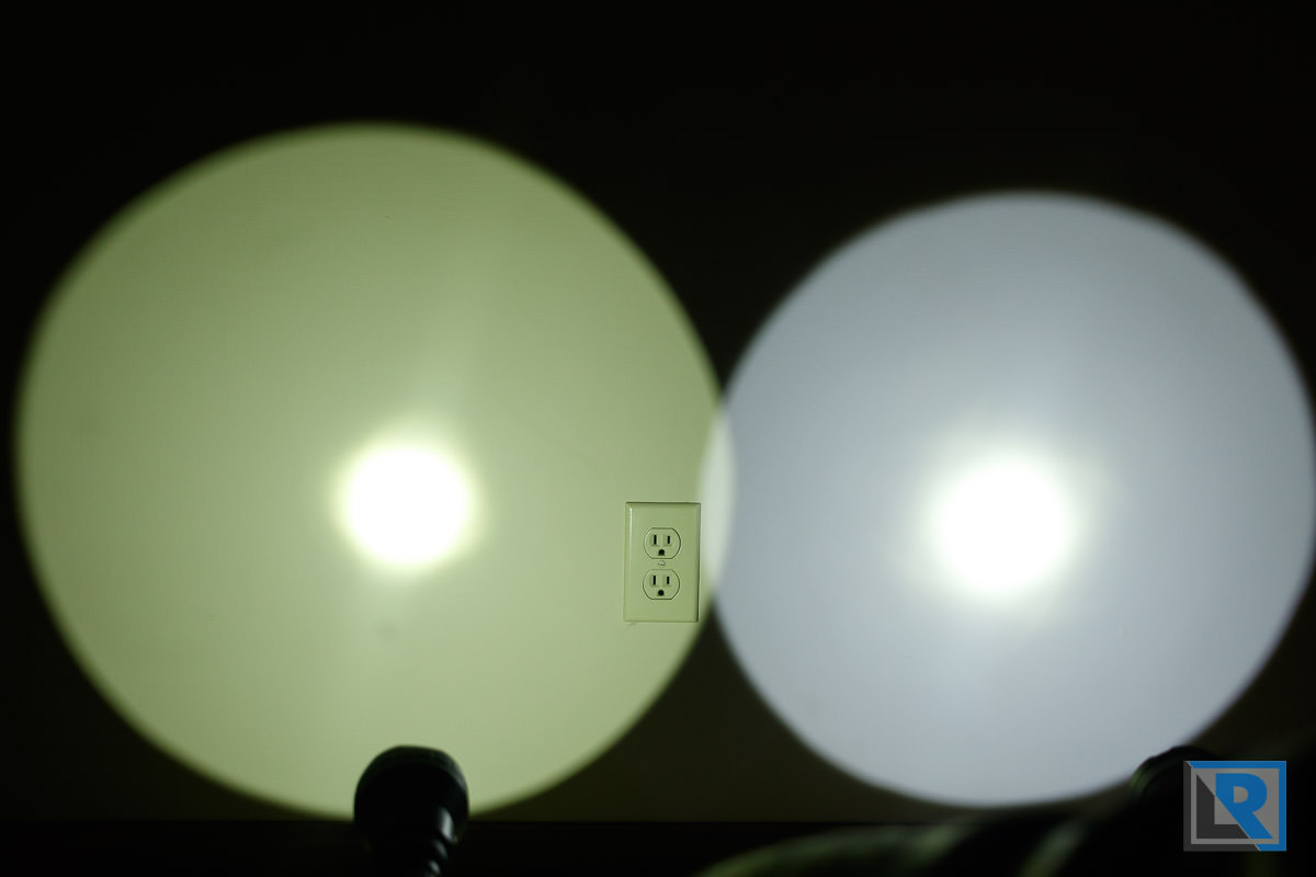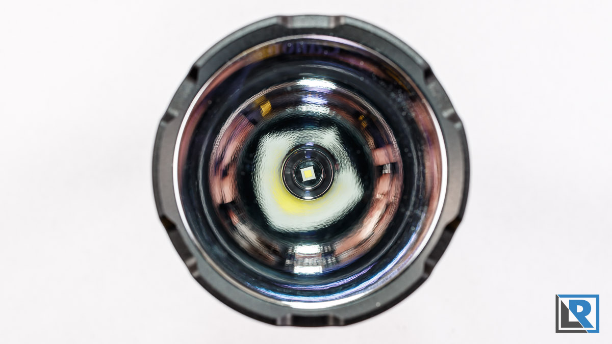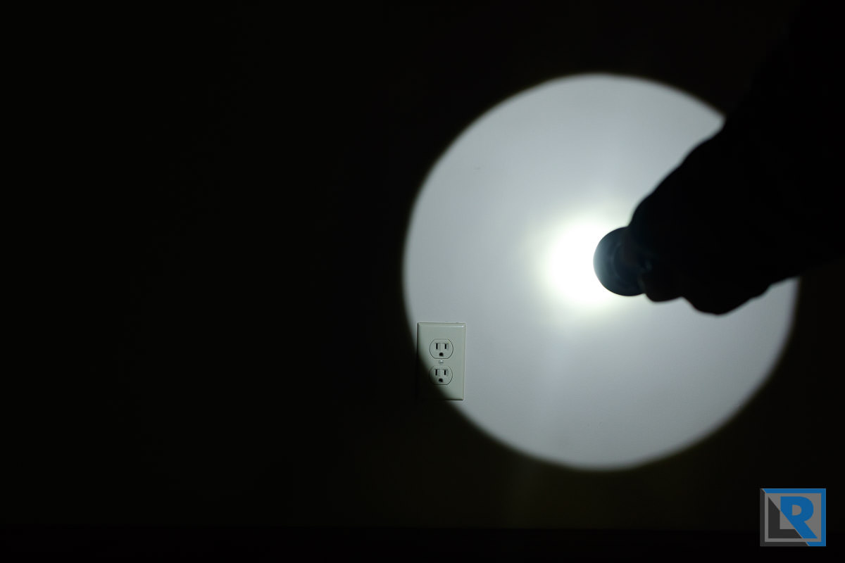 LED Cree XP-L Hi V3 độ sáng tối đa 1200lm. Nhiệt độ màu là trắng lạnh, và như tôi thấy không quá lạnh. Ánh sáng phát ra điển hình của một cây đèn chiếu xa. Ở khoảng cách 1ft, quầng sáng nhỏ như cái bánh. Khoảng cách chiếu xa hơn một chút, quầng sáng có một vùng rất mạnh và tập trung ở giữa nhưng vùng tràn nhỏ và viền nét. Độ sáng thấp là 20 lumen, trung bình 100lm, cao 400lm và turbo là 1200lm. Chỉ số candela 250,000 đo ở nấc turbo.