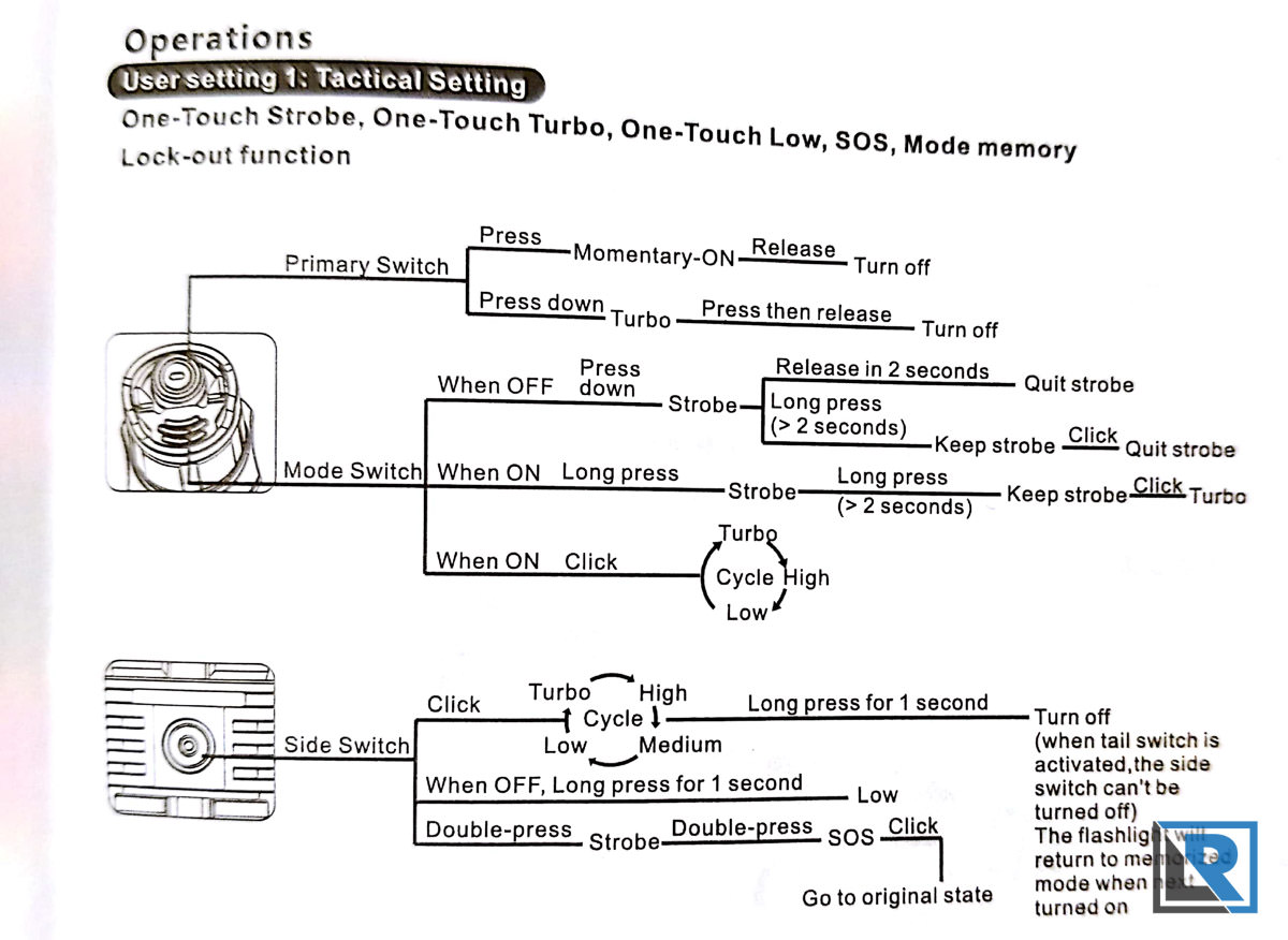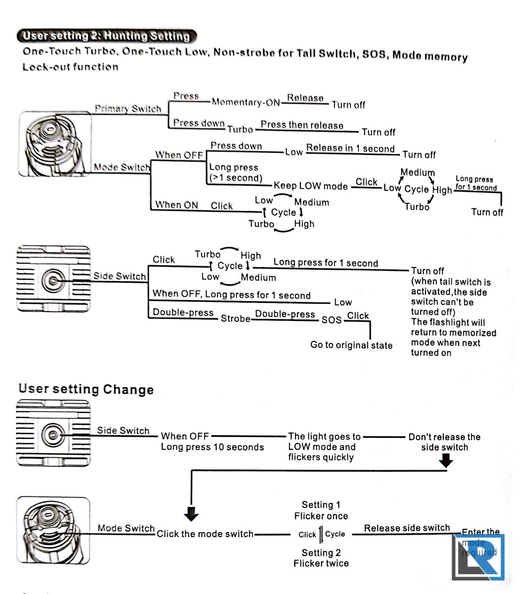 Trong chế độ tác chiến, bạn có thể ngay lập tức kích hoạt strobe và turbo với 1 click. Chức năng 1 click Low, SOS và nhớ nấc sáng đã bị vô hiệu hóa. Trong chế độ Săn bắn thì 1 click Low, 1 clock Turbo, không có 1 click strobe và có thêm SOS, nhớ nấc sáng, và khóa. Hình vẽ trên hướng dẫn sử đụng đã giải thích rõ các chế độ và làm thế nào để chuyển chế độ. Với cá nhân tôi, tôi thích chế độ Săn bắn vì tôi có thể kích hoạt ngay turbo bằng cách ấn công tăc on/off và kích hoạt ngay low bằng cách ấn công tắc mode. Công tắc bên ở đầu đèn cho phép bạn xoay vòng các nấc sáng, hoặc click đúp strobe.