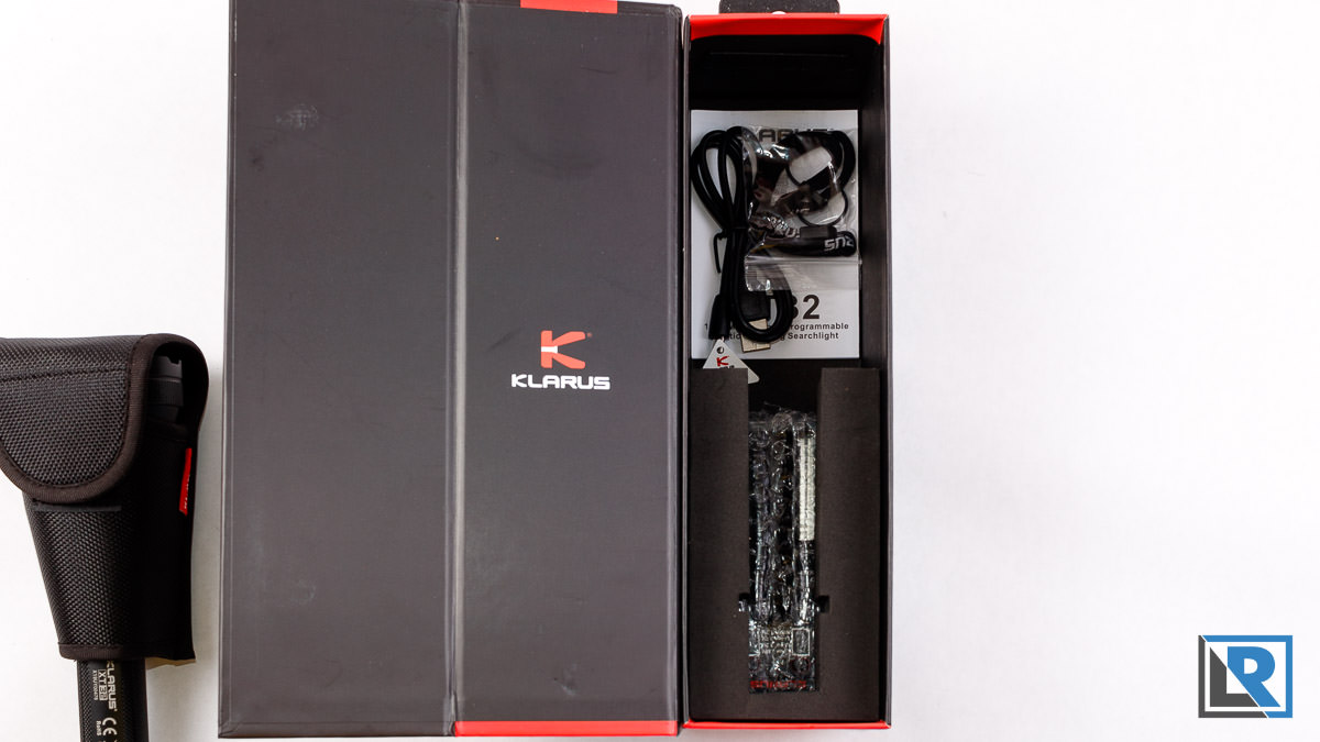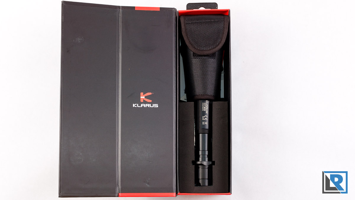 Cây đèn nằm gọn gàng trong chiếc hộp khá đẹp mắt. Đèn được lắp sẵn pin nhưng có một miếng plastic ở đuôi pin để cách điện. Trong hộp có bộ sạc Klarus. Dây đeo khá mảnh và có vẻ không tương xứng so với kích thước cây đèn. Đèn được cho vào trong 1 chiếc bao để đeo thắt lưng.