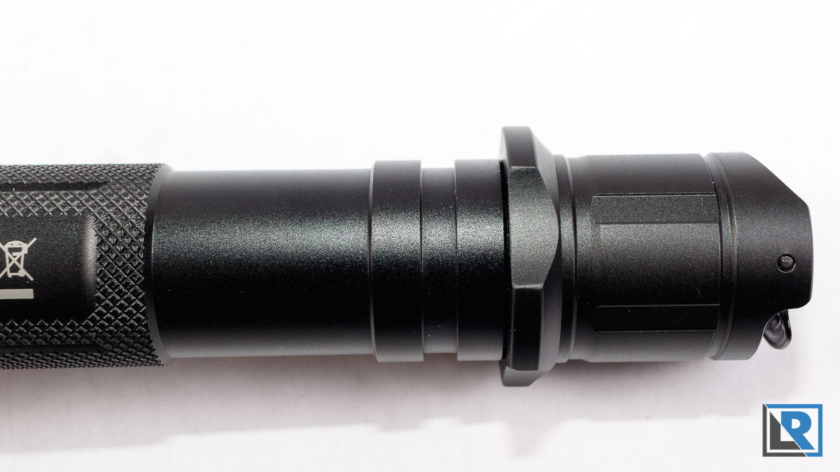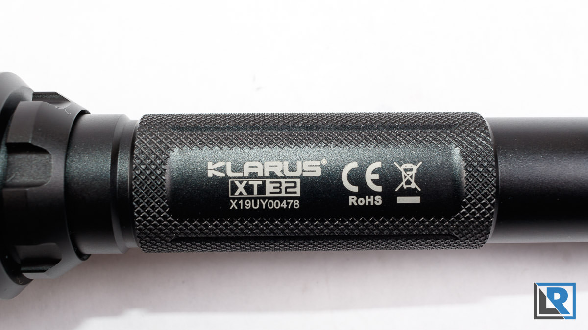 Quan sát các đường ren ở trên thân đèn, có vẻ như là là nhôm trần. Các đường ren vuông, dày dặn, được bôi trơn cẩn thận. Dưới đó là vòng tác chiến (tactical ring), được thiết kế có thể xoay được, không như các hãng khác thiết kế gắn cố định trên thân. Theo như Klarus giải thích, thiết kế lỏng của tactical ring là để tăng độ bền. Trên tactical ring cũng có lỗ để luồn dây đeo. Phía dưới tiếp thân, ta có thể thấy 1 phần như để cài clip, nếu có. Dưới nữa là 1 đoạn thân ngắn, trơn. Có lẽ phần này dùng để lắp vào bộ gá súng của Klarus. Tiếp theo phần thân đèn là phần thân được gia công với những đường vân chéo, với chức năng hỗ trợ cầm nắm không bị trơn trượt. Phần vân này có 2 vùng phẳng, 1 vùng với tên hãng, model của đèn, và các thông tin liên quan, phần còn lại, đối diện bên kia để trống.