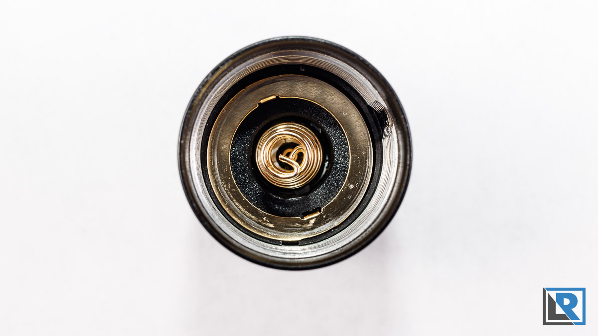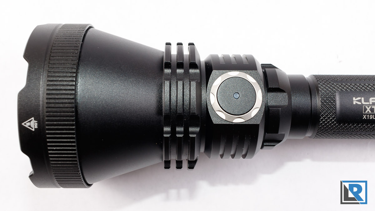 Tiếp theo, phần đầu đèn, đường kính được tăng dần lên, để tăng hiệu quả tản nhiệt. công tắc bên nằm trong 1 vòng giống như vòng bạc. Công tắc bản thân nó màu đen với đèn LED nhỏ hiển thị ở giữa. Đây là đèn hiển thị dung lượng pin. Đầu đèn khá to, và có răng ở đầu. Chóa phản xạ trơn, mặt kính phủ lớp AR chống lóa. Bóng Led XP-L được bố trí chính giữa chóa đèn.