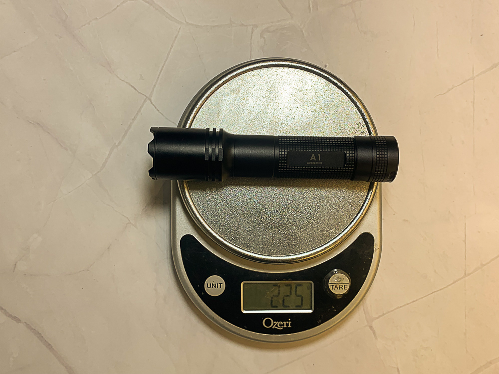 KLARUS A1: khối lượng đèn: 225g cả pin với kích thước là 35mm (đầu đèn) x 160,5mm (chiều dài)