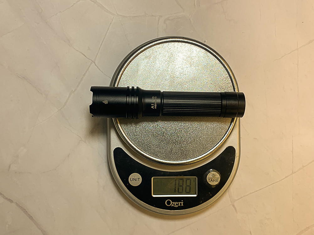 KLARUS A1 PRO: khối lượng đèn: 188g cả pin với kích thước là 34mm (đầu đèn) x 160,5mm (chiều dài)