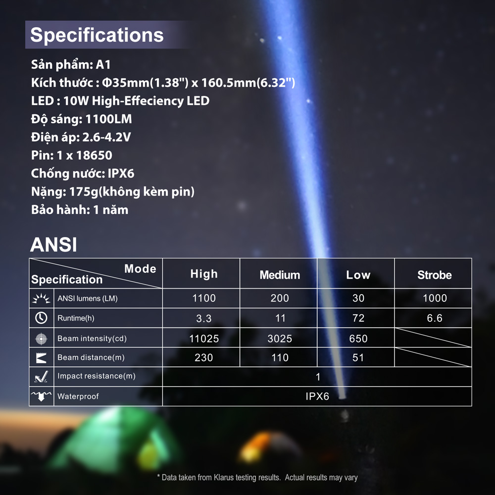 Theo công bố của hãng: Klarus A1 có độ sáng 1100 lumen tầm chiếu xa 230m nhiệt màu khoảng 5500K. Trong khi đó đèn Klarus A1 PRO có độ sáng cao 1300 lumen tầm chiếu xa 230m, nhiệt màu khoảng 5500K.
