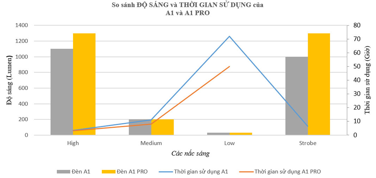 Qua bảng runtime ta thấy vì độ sáng và công suất gia tăng nên phiên bản Klarus A1 Pro sẽ có thời lượng pin ngắn hơn Klarus A1. Nhưng thời lượng pin của Klarus A1 Pro vẫn rất ấn tượng, lên tới hơn 50 tiếng ở nấc sáng thấp nhất và hơn 3 tiếng ở nấc sáng cao nhất. Dễ hiểu điều đó vì công suất của A1 Pro lớn hơn A1 với nấc sáng High lên tới 1300 lumen, vượt hơn nấc sáng High của A1 là 1100 lumen.