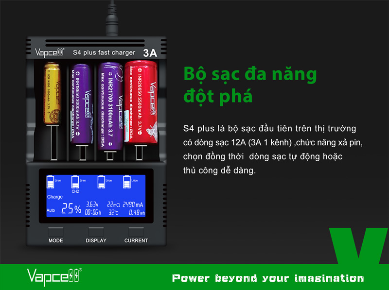 Ra mắt Vapcell S4 plus - bộ sạc ĐẦU TIÊN trên thị trường có đầy đủ chức năng của dòng sạc 12A (3A / khe cắm), Chức năng xả, Kiểm tra dung lượng, Chức năng sửa chữa và Dễ dàng thay đổi dòng sạc thông qua chế độ Thủ công và TỰ ĐỘNG cho một bộ sạc.